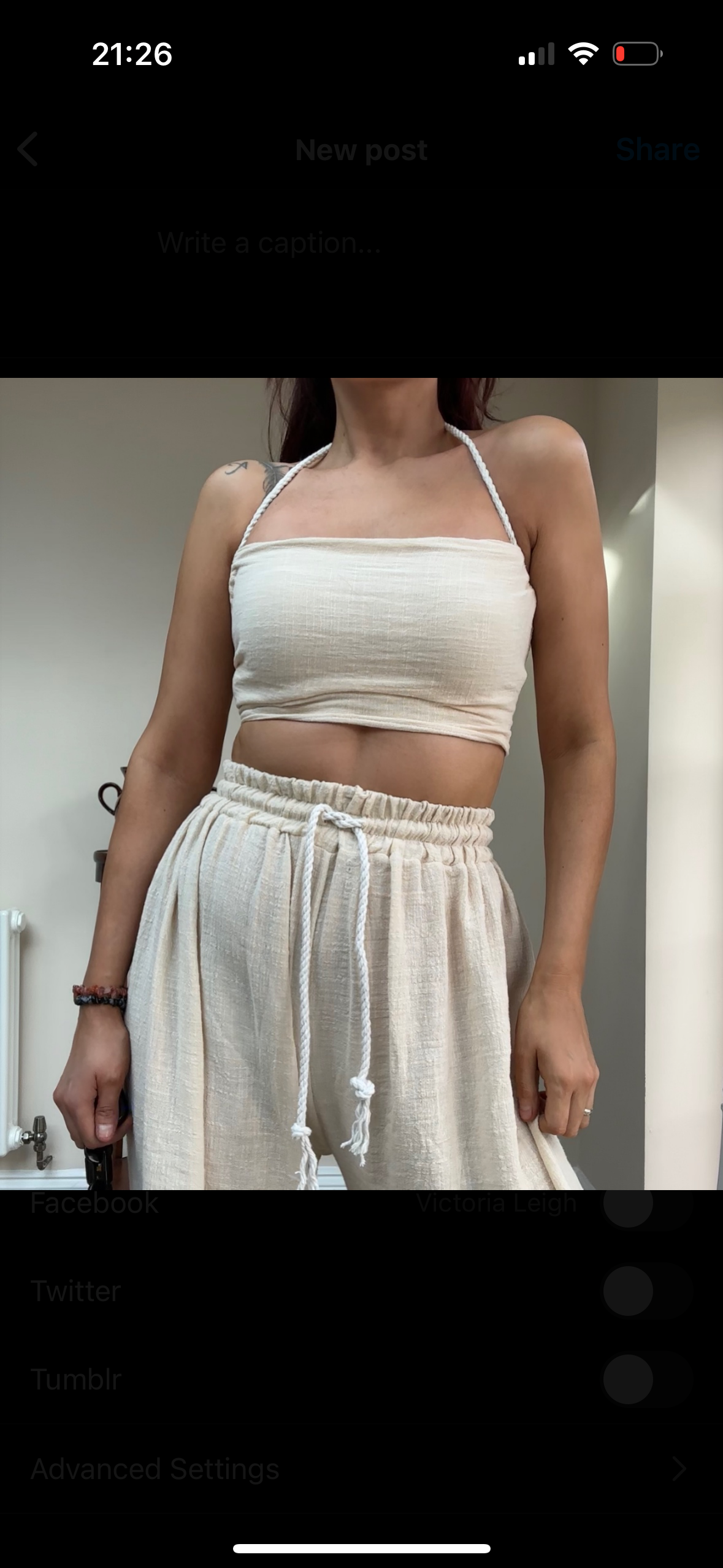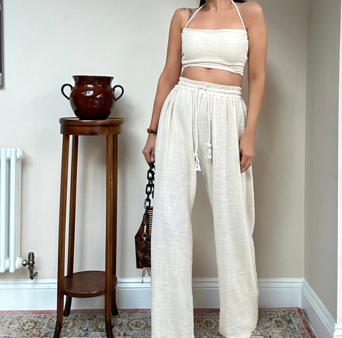 Elasticated High waisted wide leg trousers with cotton rope tie finish.
