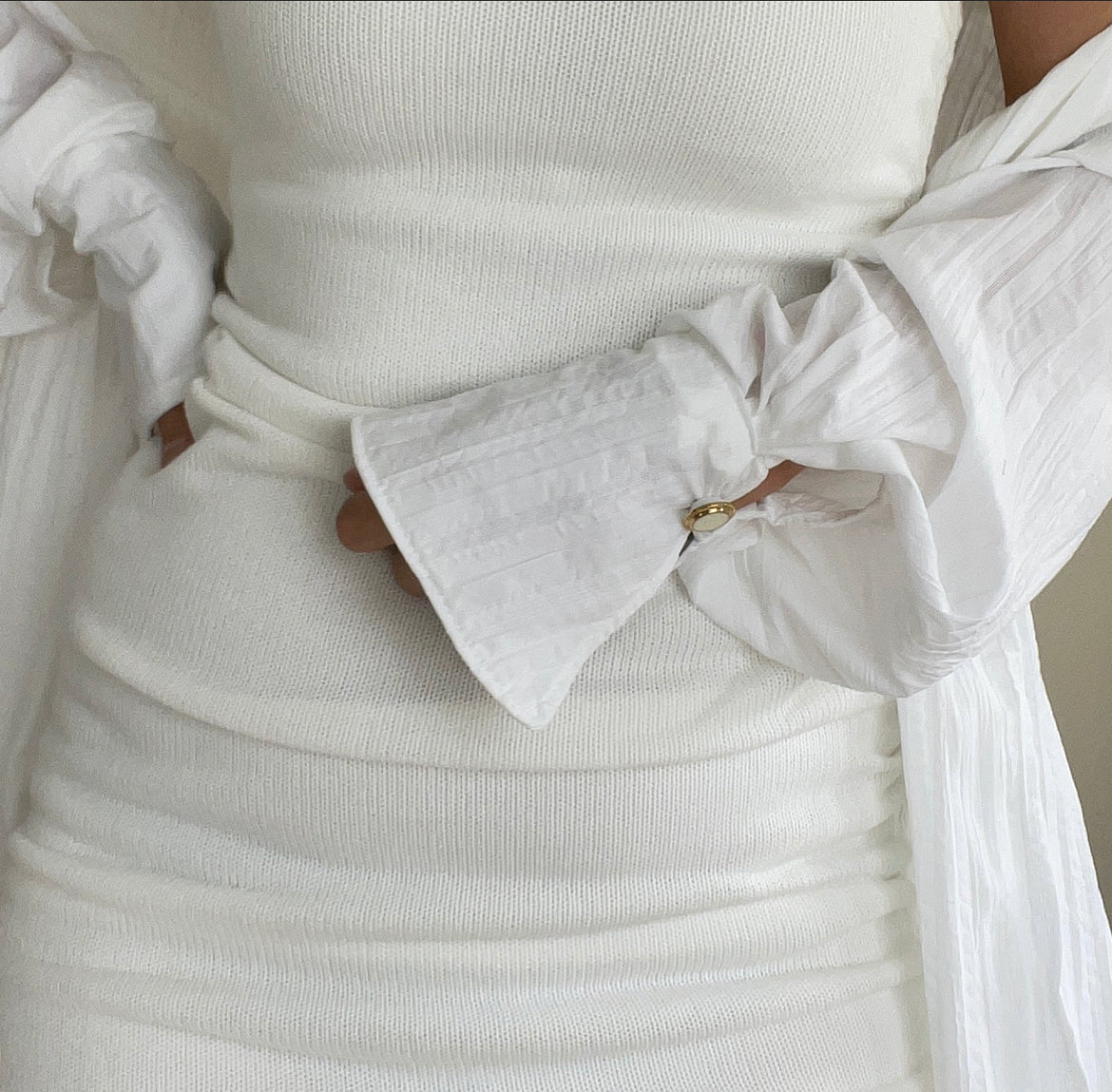 Featuring a flare sleeve detail with a faux Pearl and gold button.