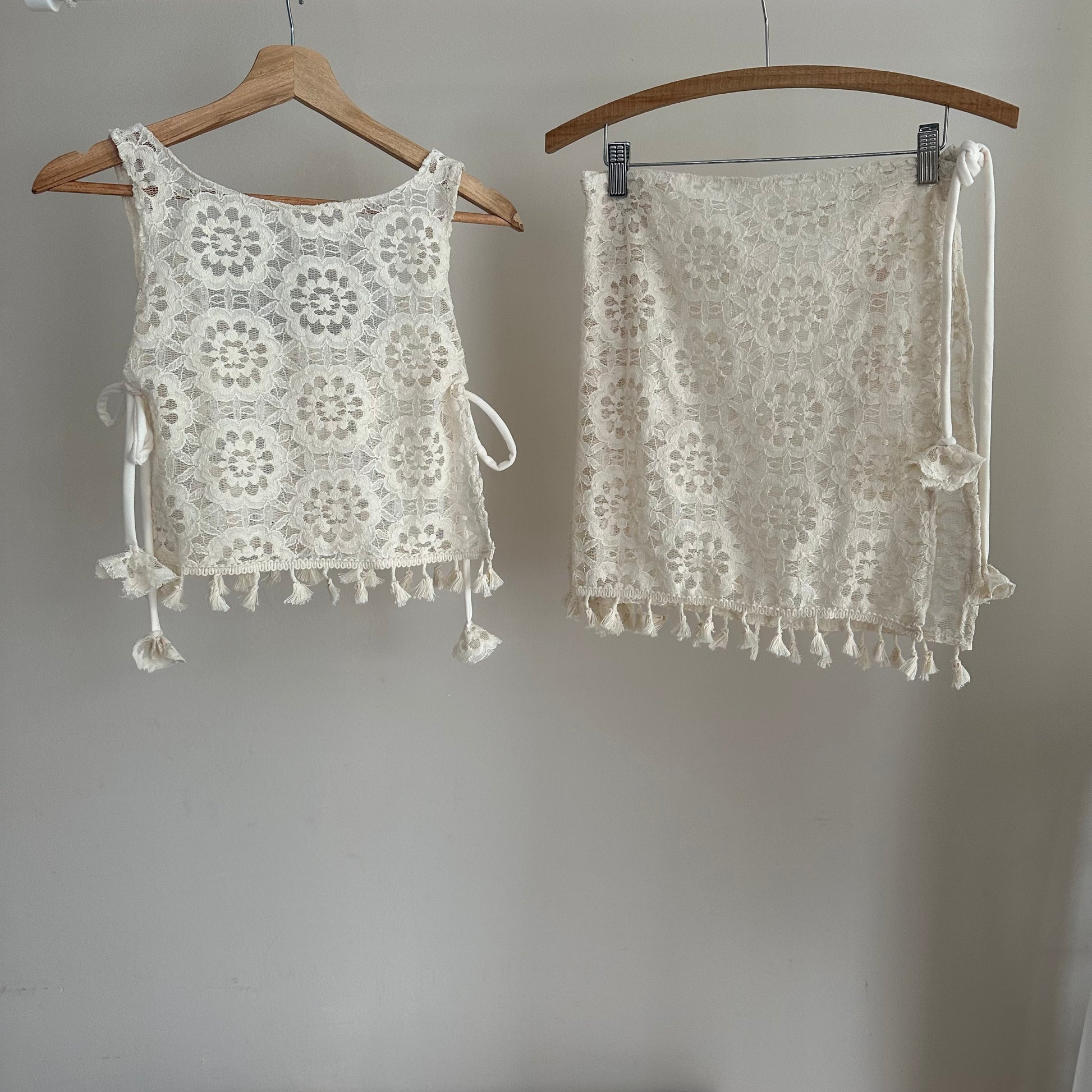 Boxy crop top with tie side detail and a sarong wrap skirtwith cotton tassel trim. Ties are finished with crochet lace tassels.