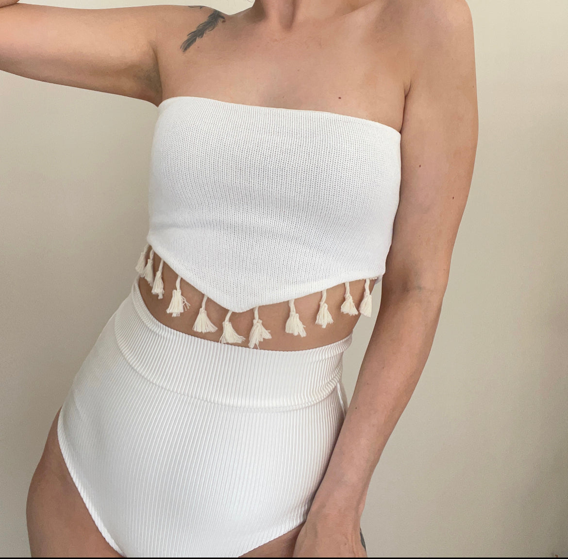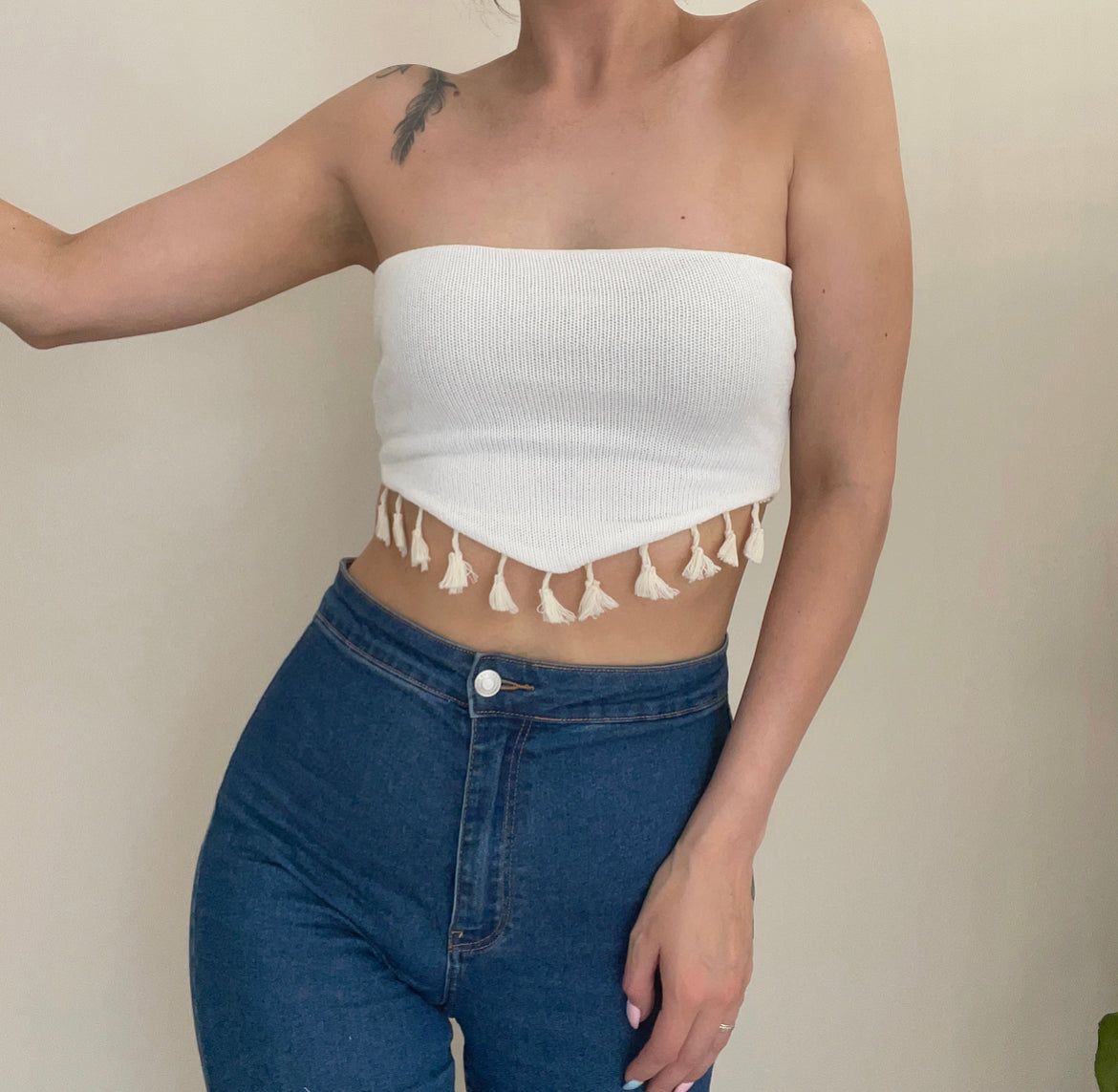Knit bandeau featuring a dipped tassel trim front & tie back.