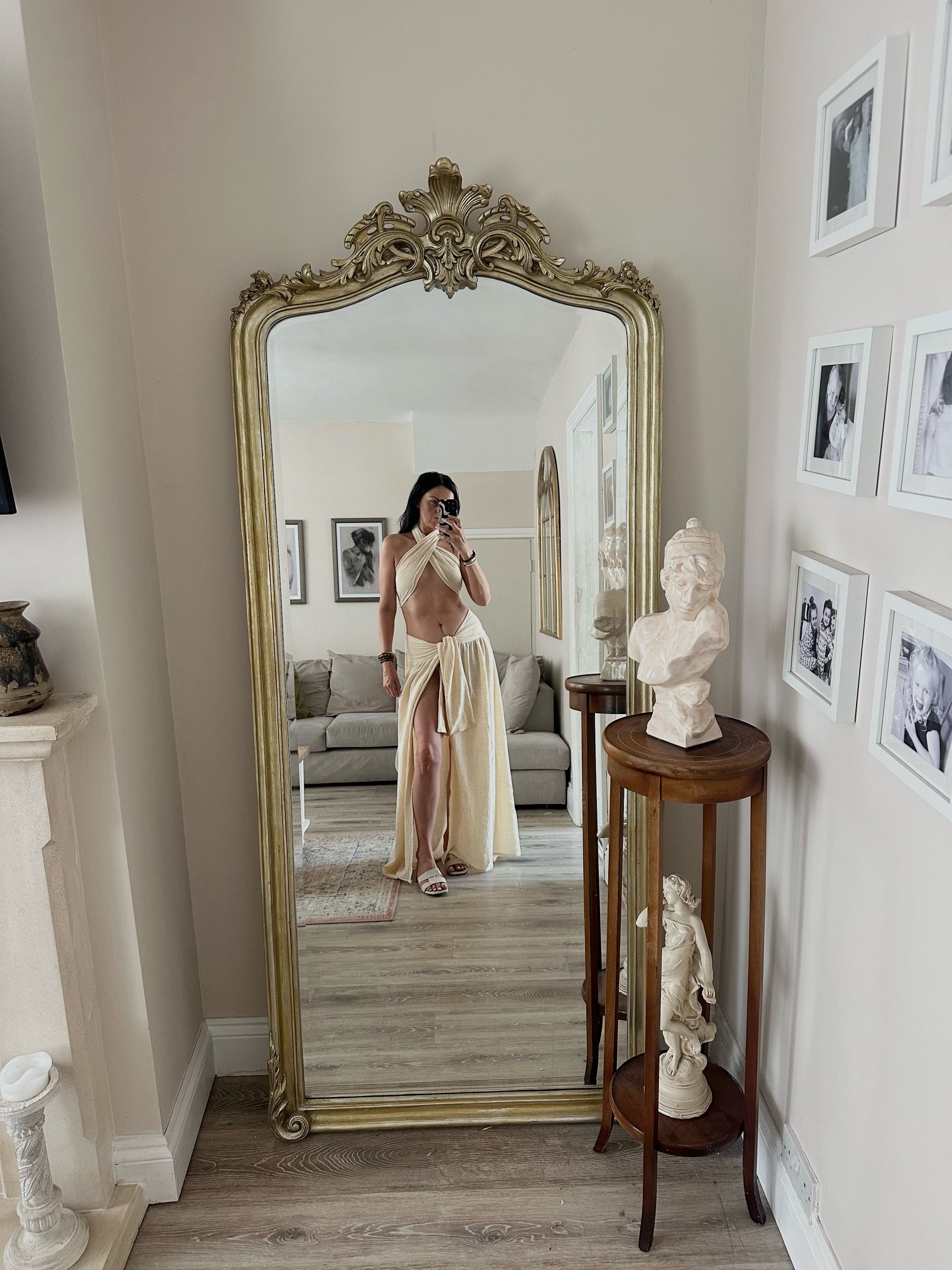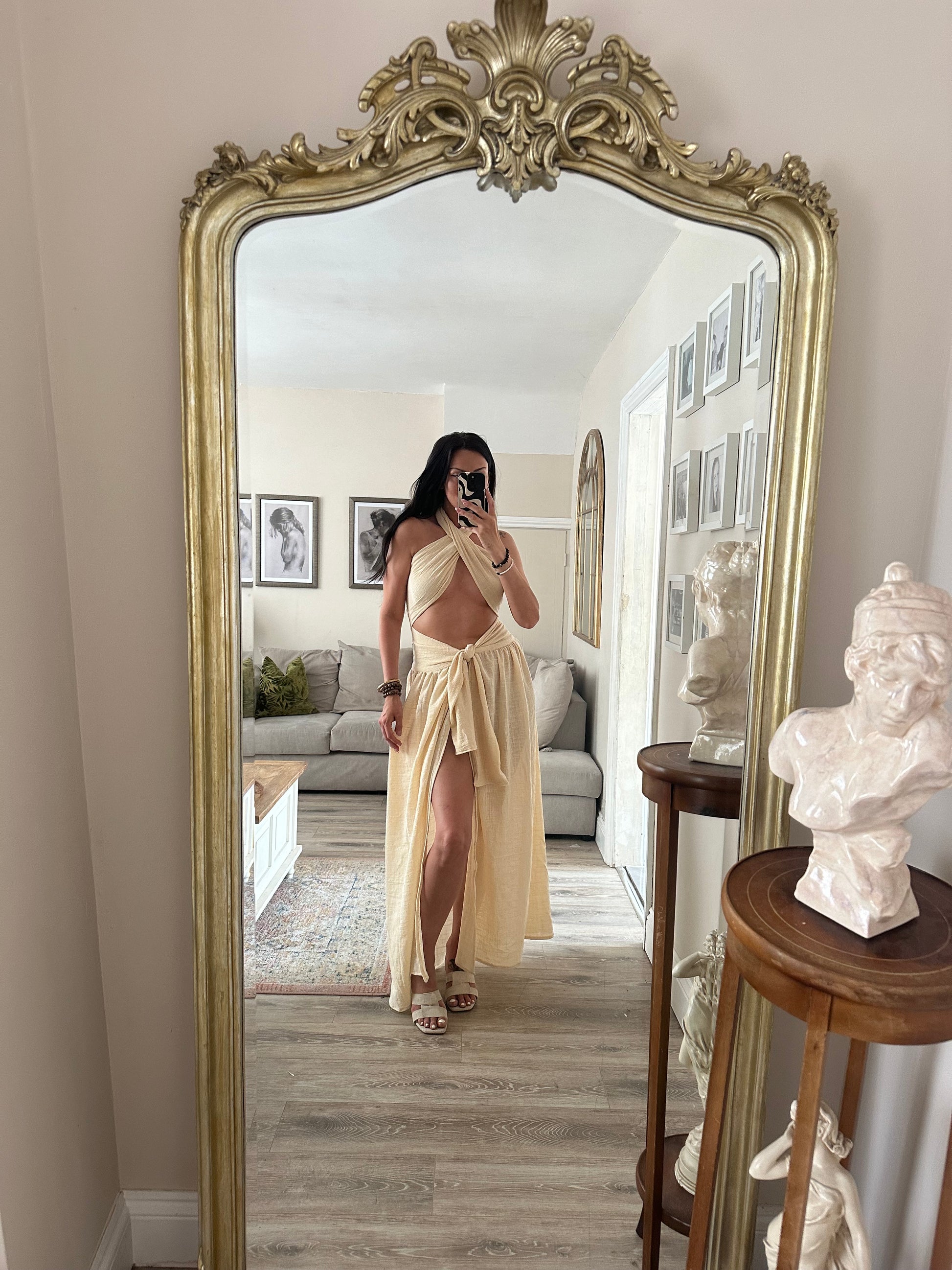 PLEASE ADD WAIST TO FLOOR MEASUREMENTS (with heels if you would like it long enough with heels) IF you do not add length measurement it will be made to the standard website maxi length measurement of 41”.