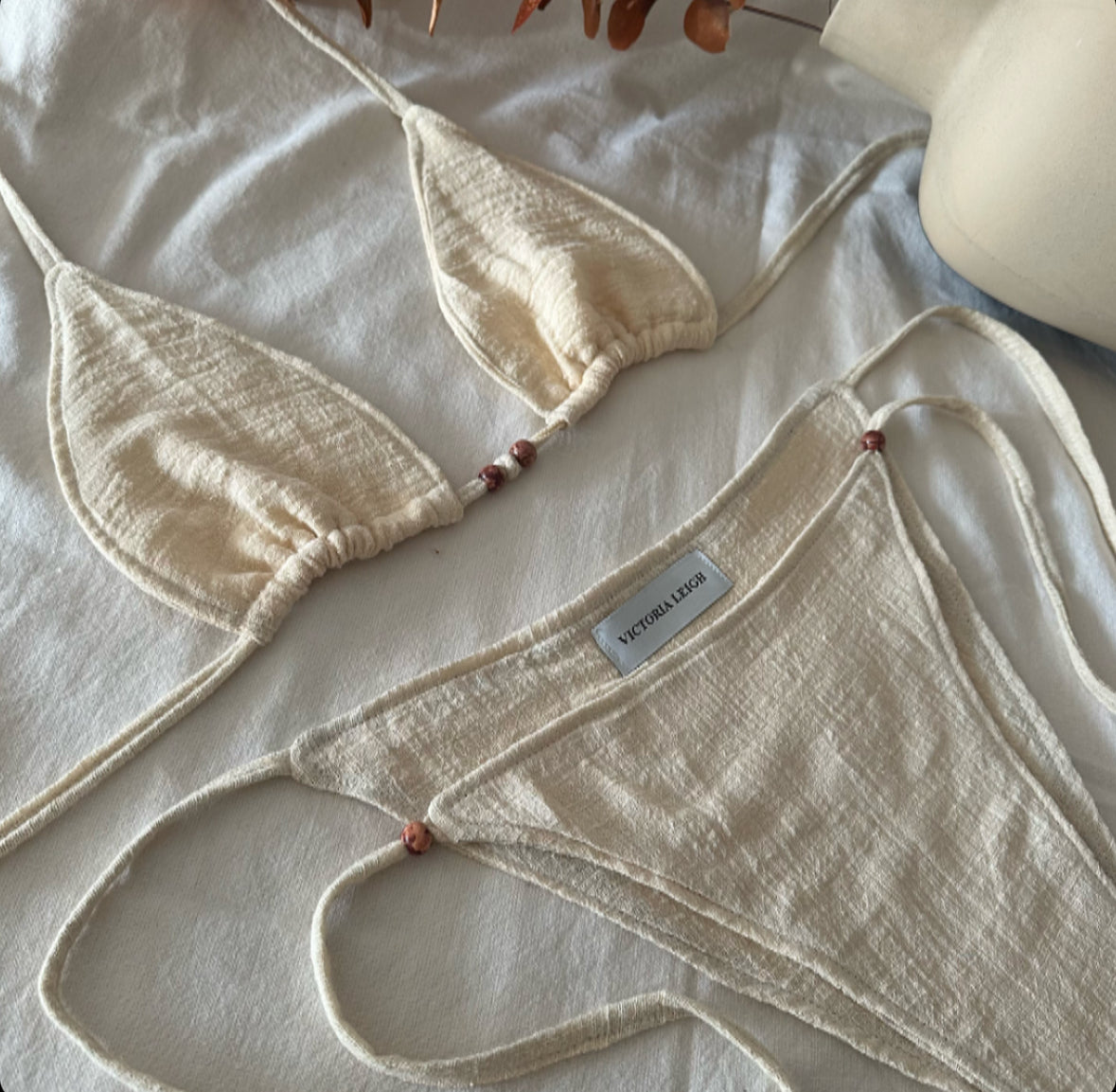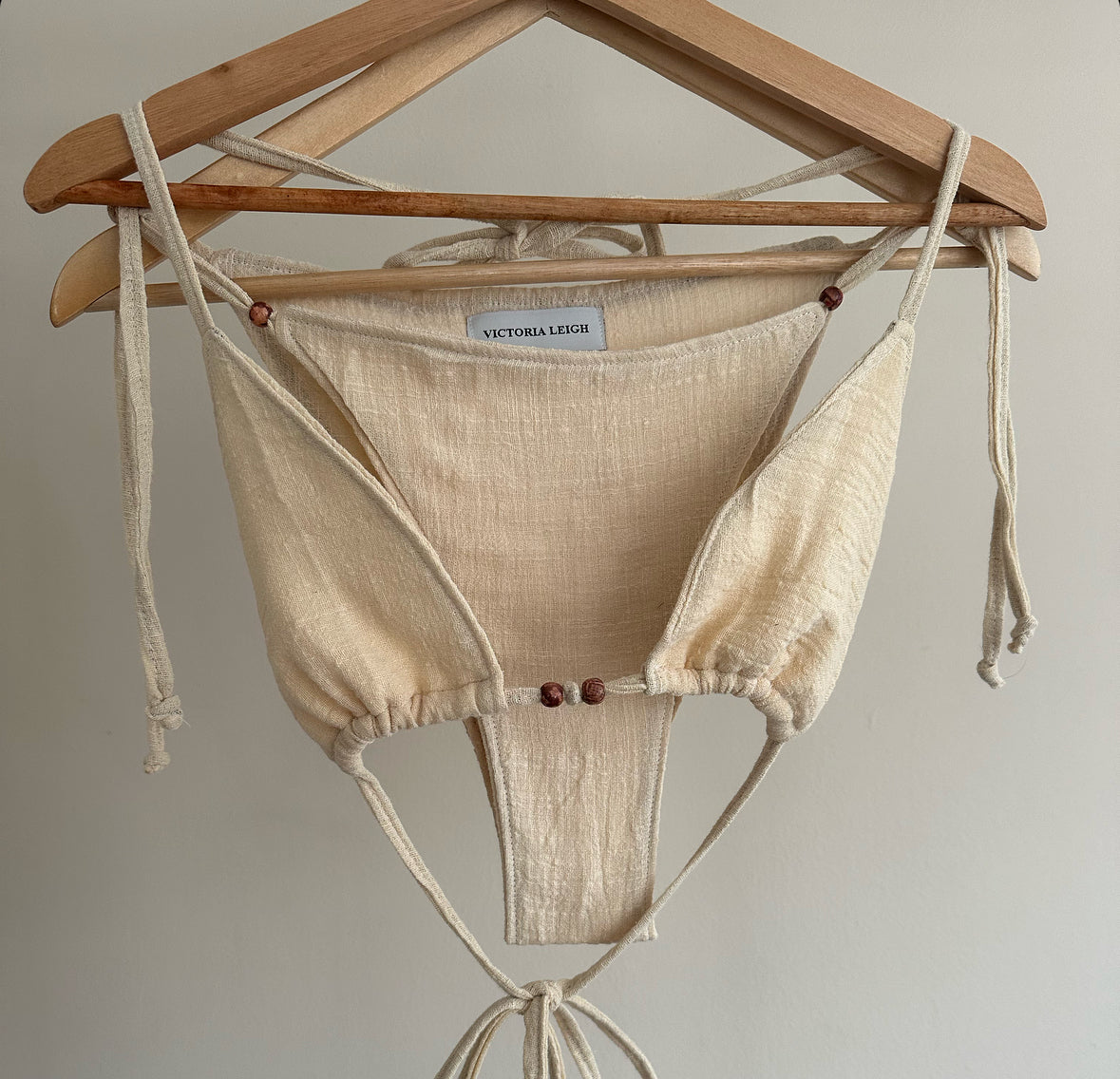 Not waterproof. Triple lined fabric. Available in Linen and Knit fabric(see ESMÉ KNIT BIKINI)