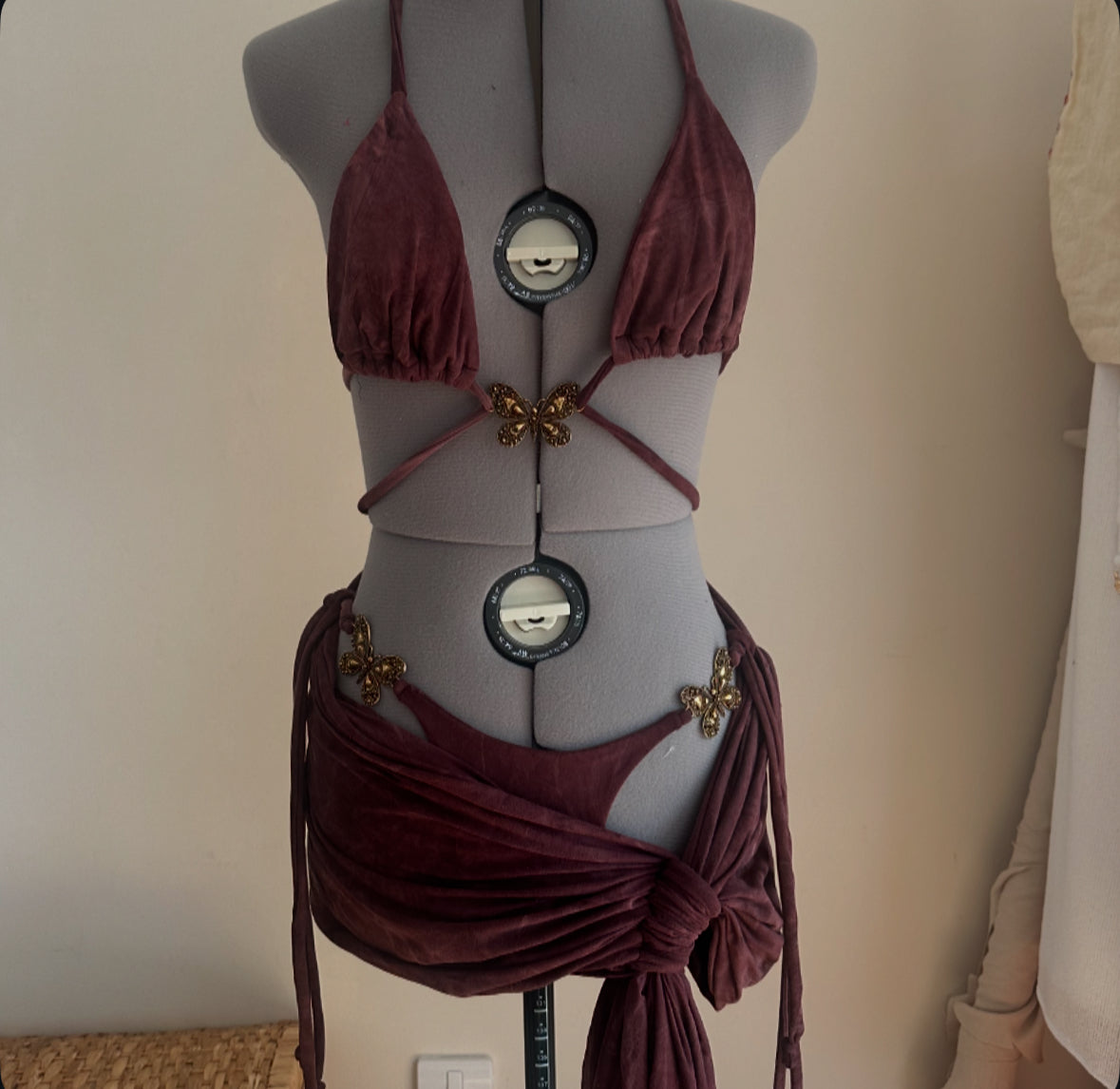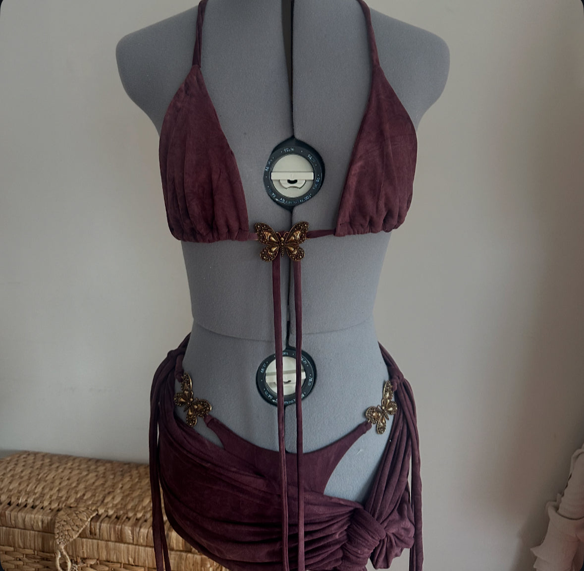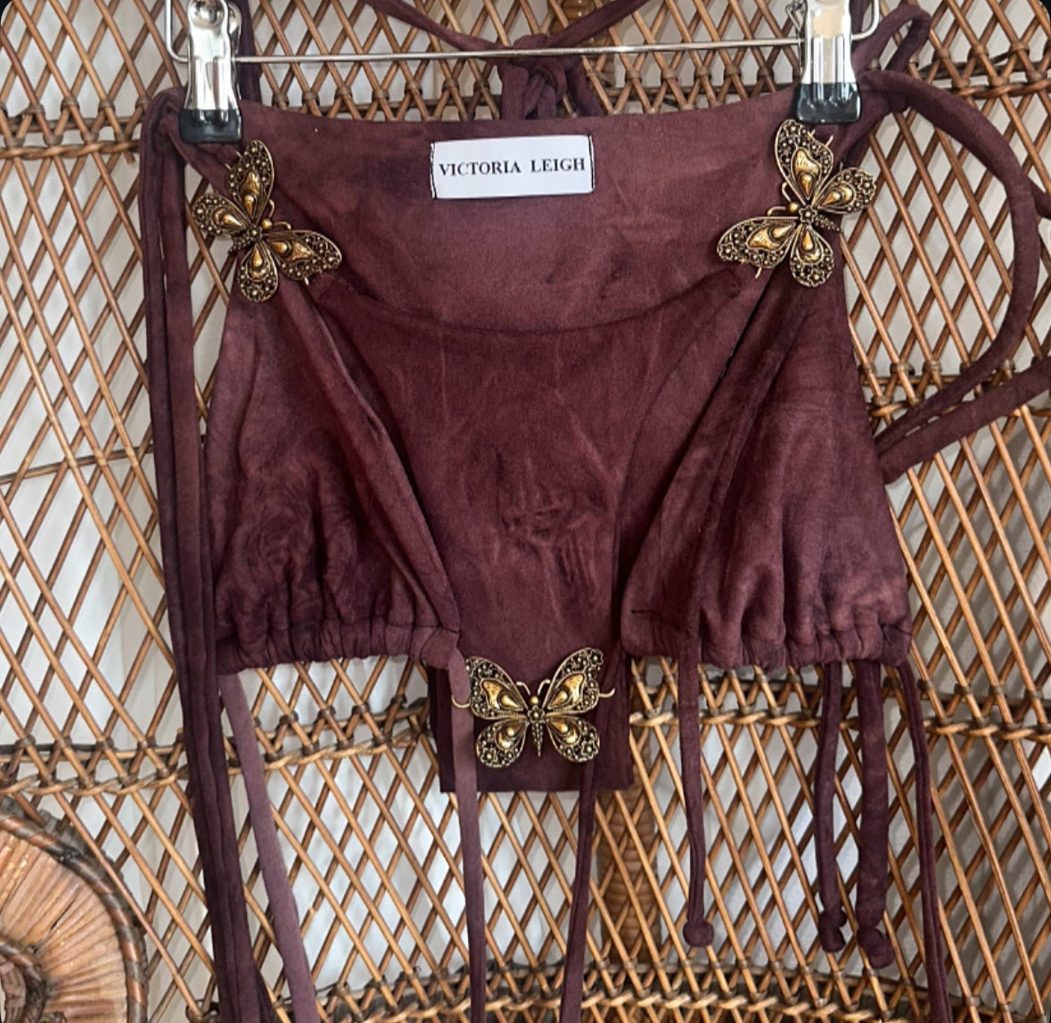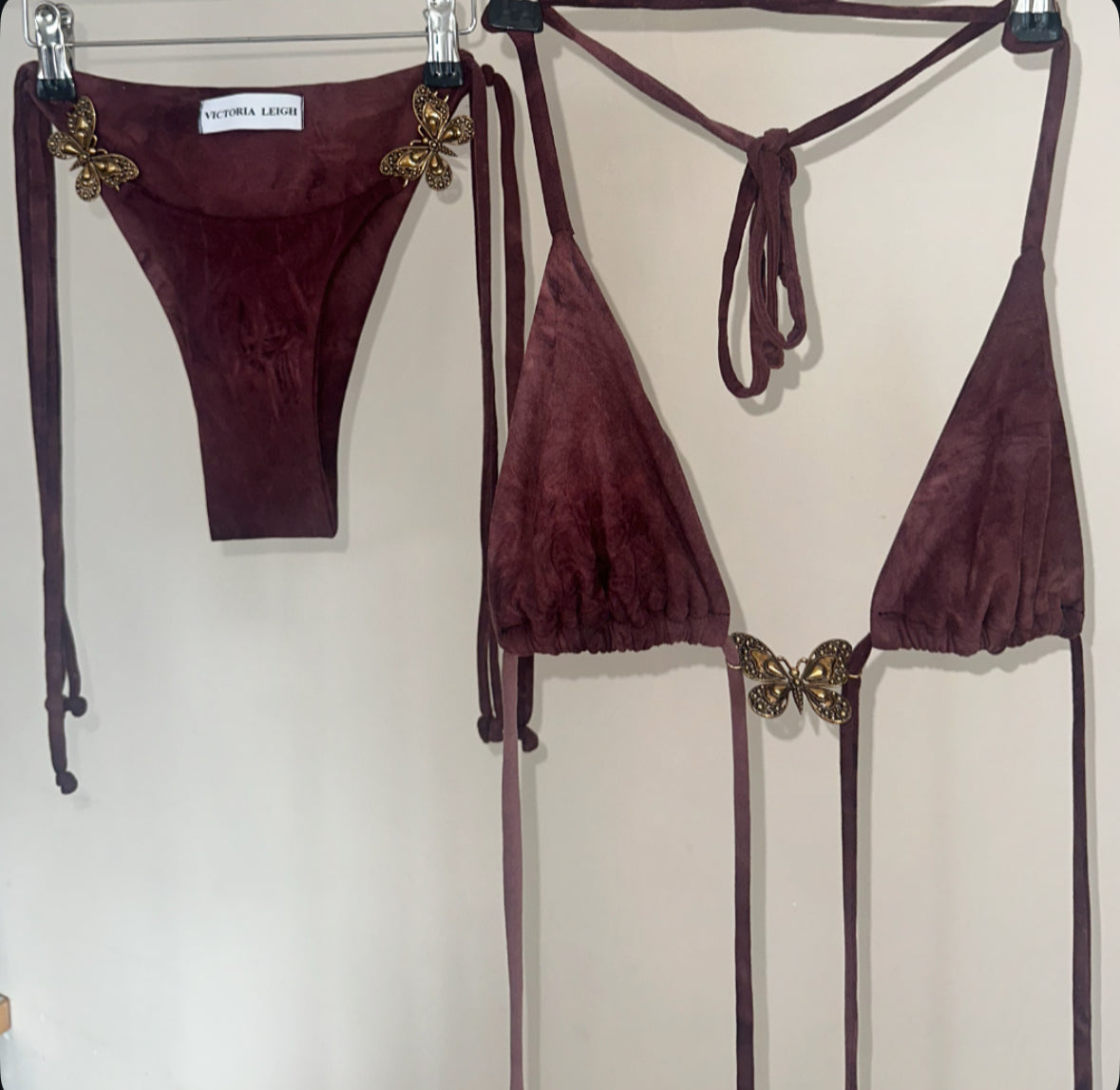 Triangular bikini top & matching knicker tie style bikini bottoms with Crome Butterly embellishments.