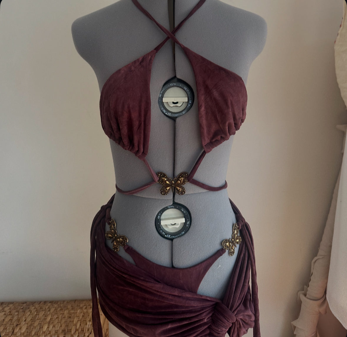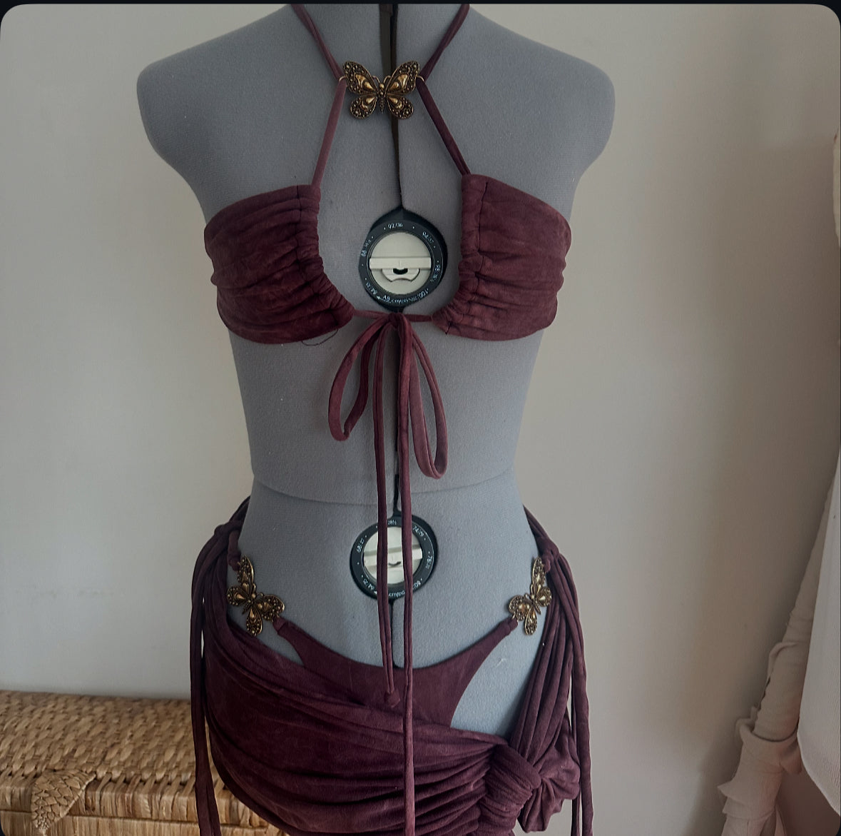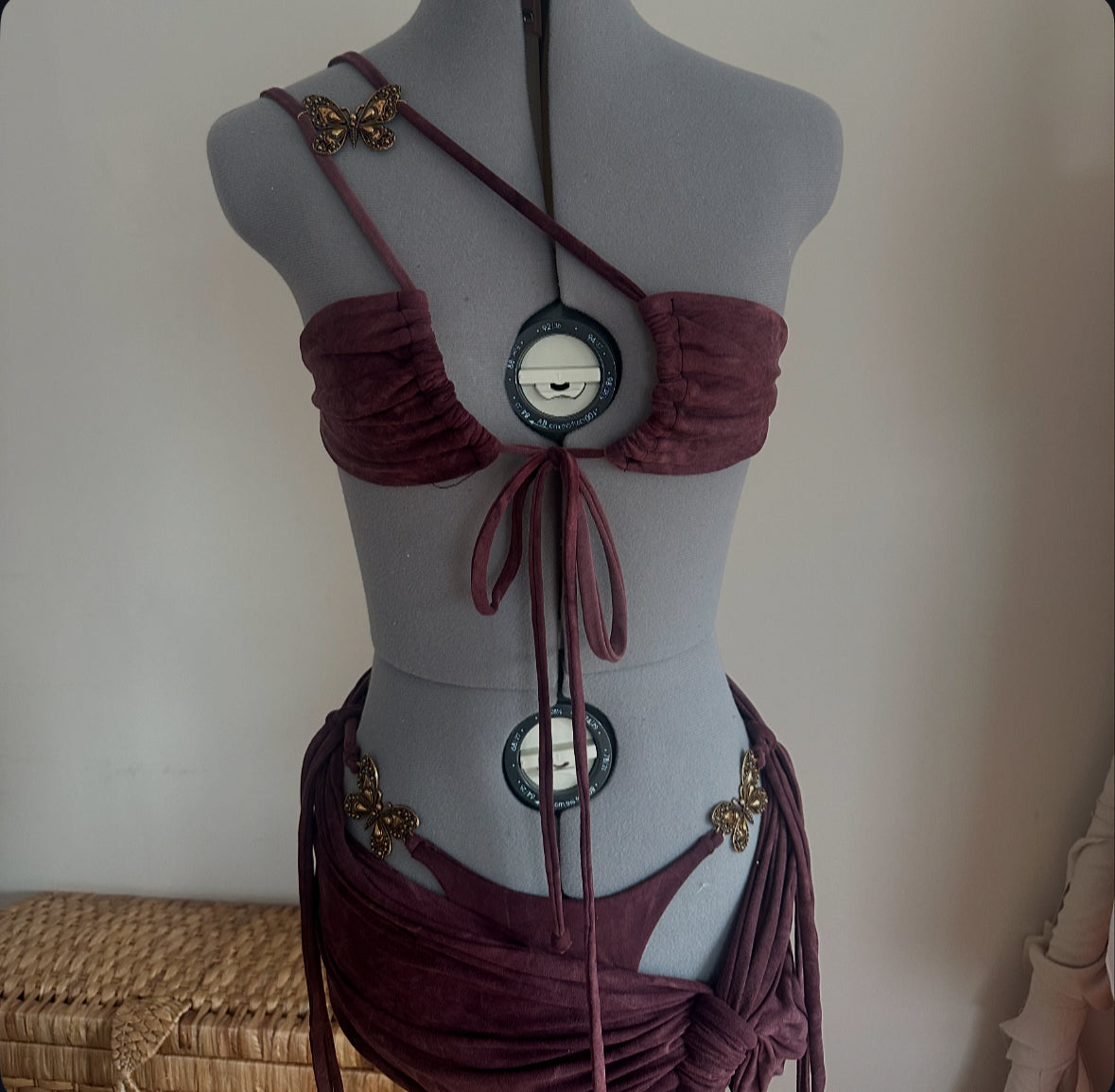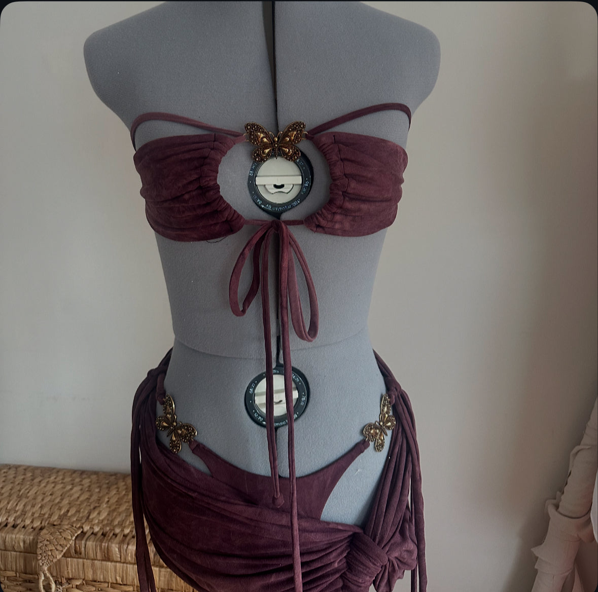 Triangular bikini top & matching knicker tie style bikini bottoms with Crome Butterly embellishments.