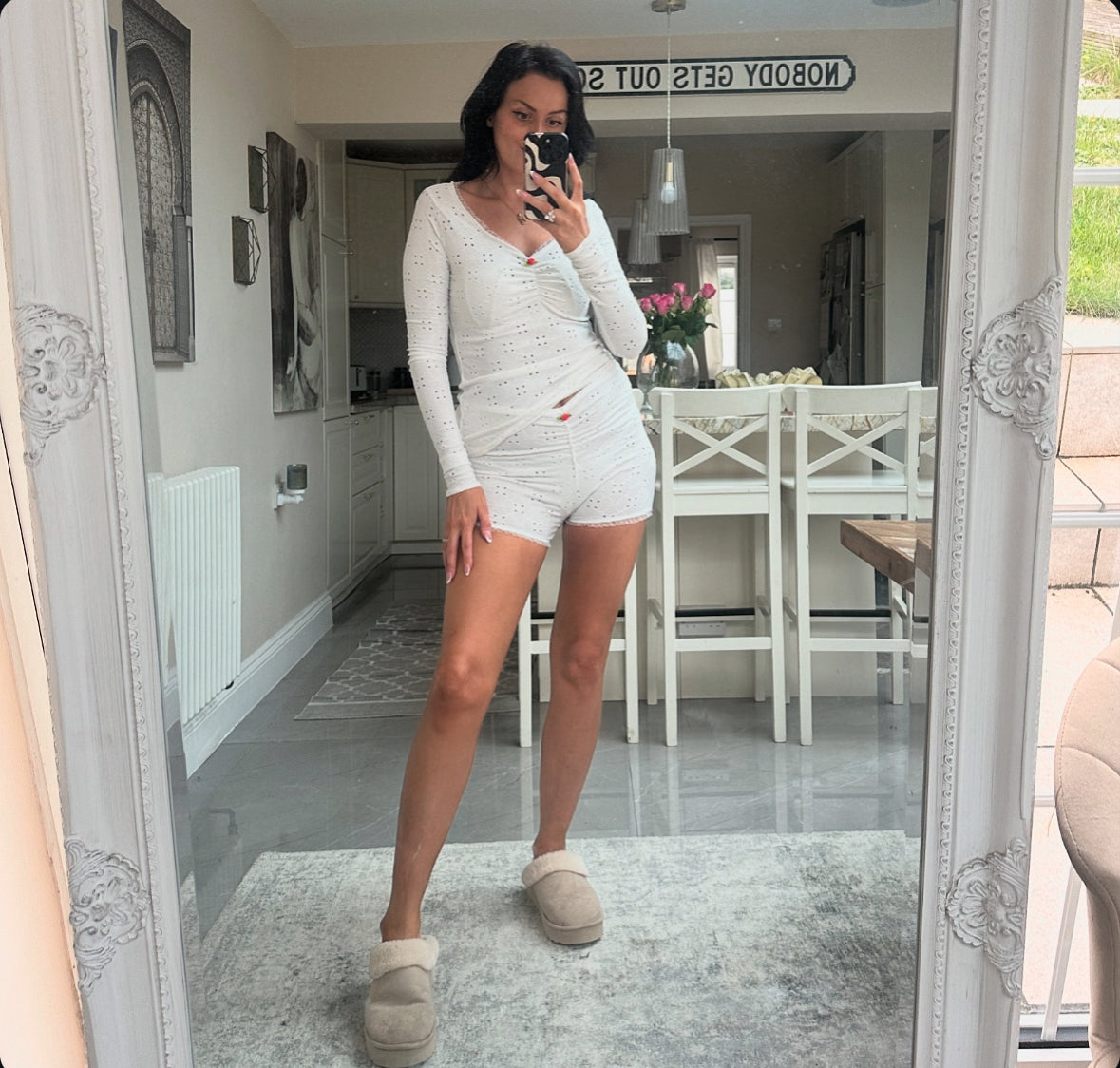 Long sleeve top & Shorts. Top features: long sleeves, gathered bust with a soft frill trim finish. Fitted shorts features: a soft frill trim and a ruched front.
