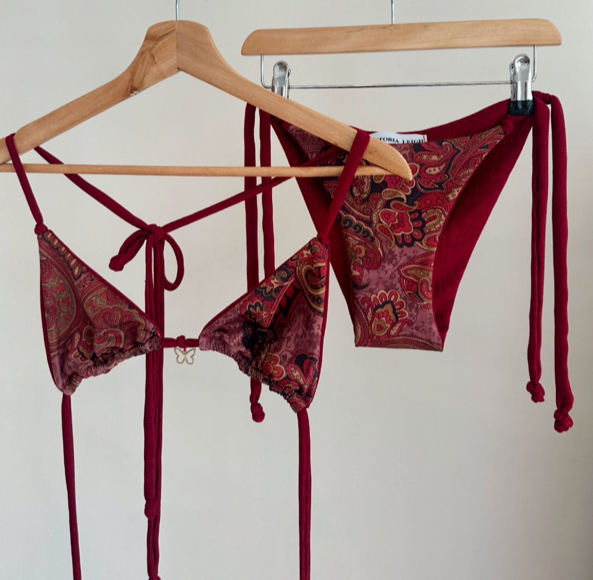 The Calypso bikini is a limited paisley print triangle bikini top & matching tie sides cheeky style bikini bottoms.
