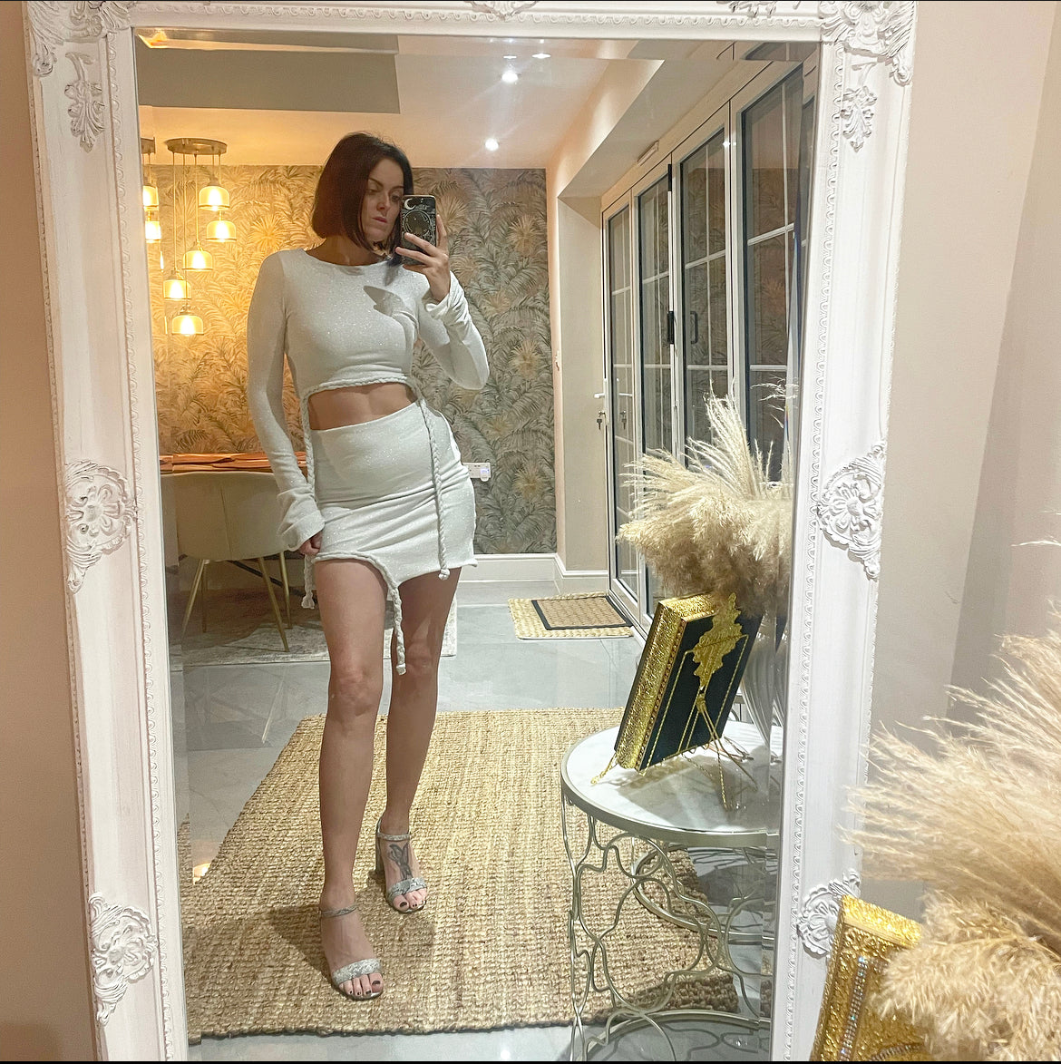 MODEL WEARS: white knit silver sparkle. Size 10.