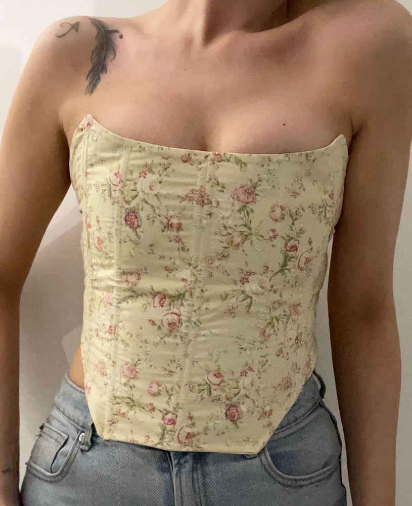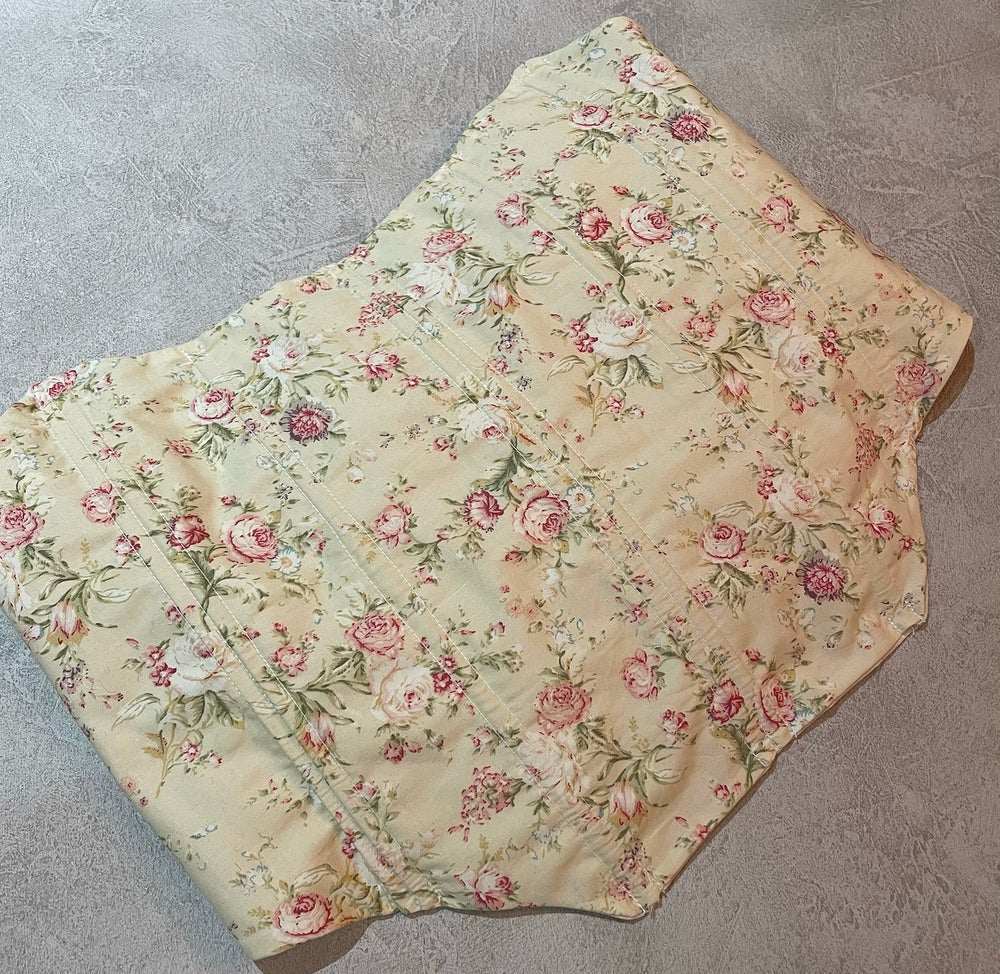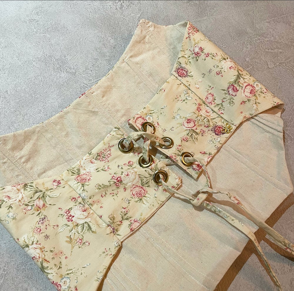 Vintage inspired corset. A statement piece perfect for many occasions. Adjustable tie back. Boning detail. . Outer fabric is cotton rose print. Lining fabric is beige cotton linen.