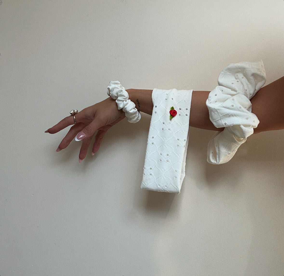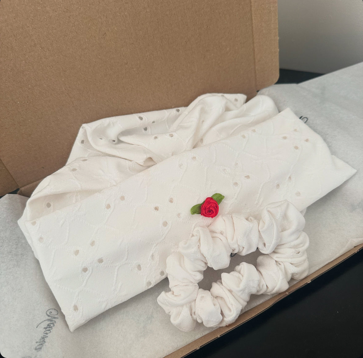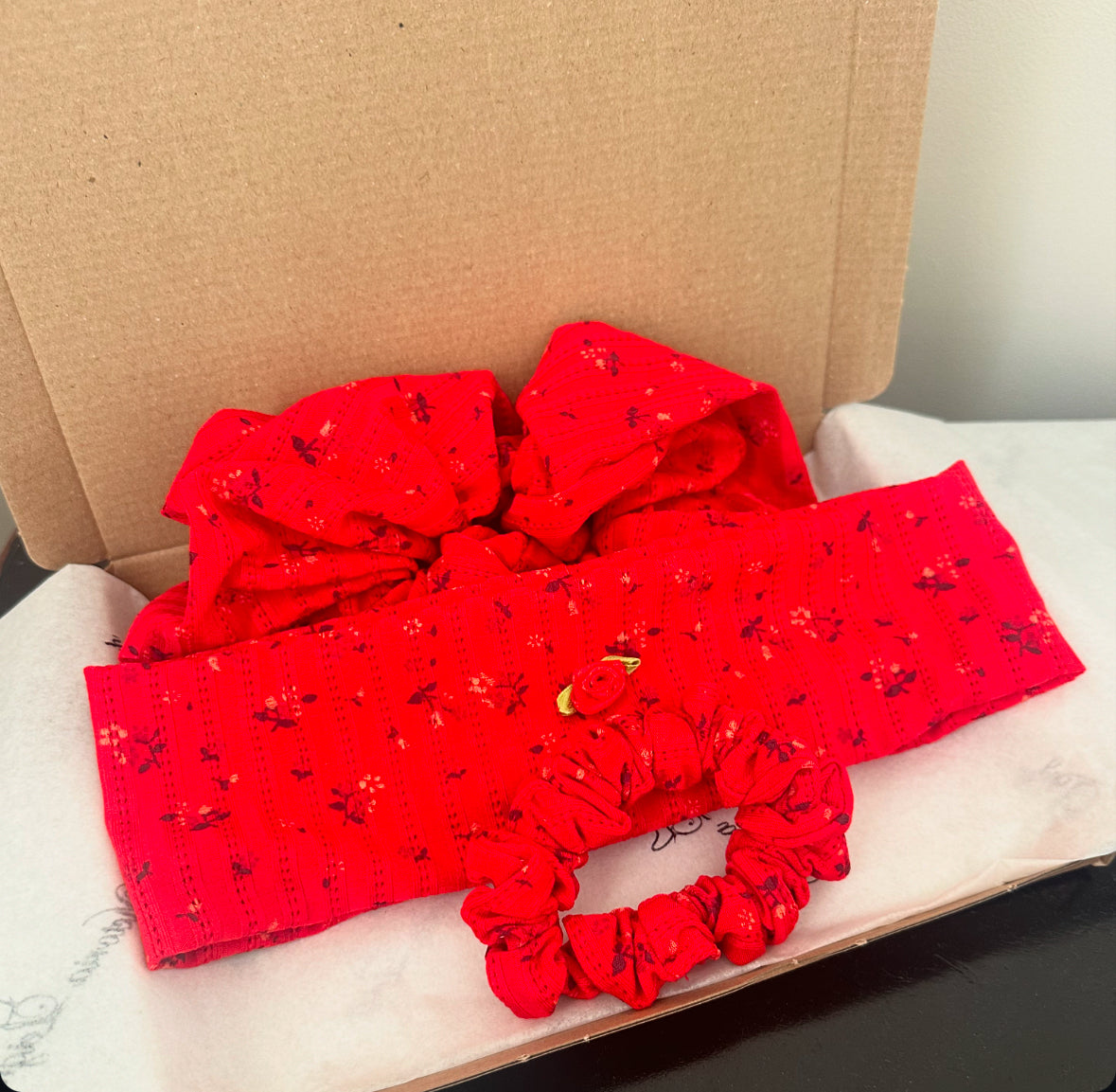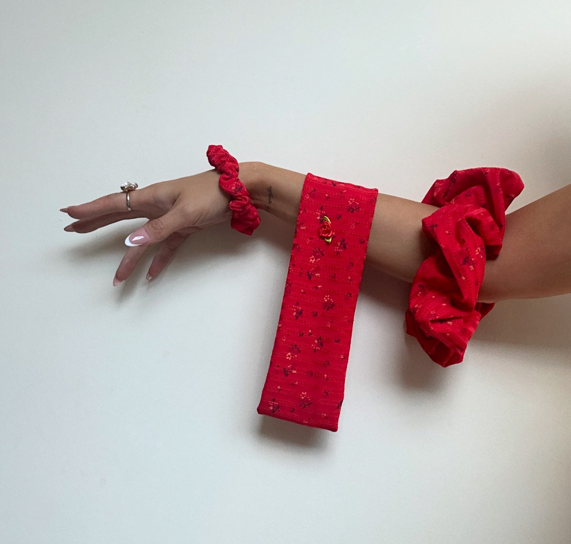 1 x oversized scrunchie, 1 x small scrunchie, 1 x rose embellished headband.
