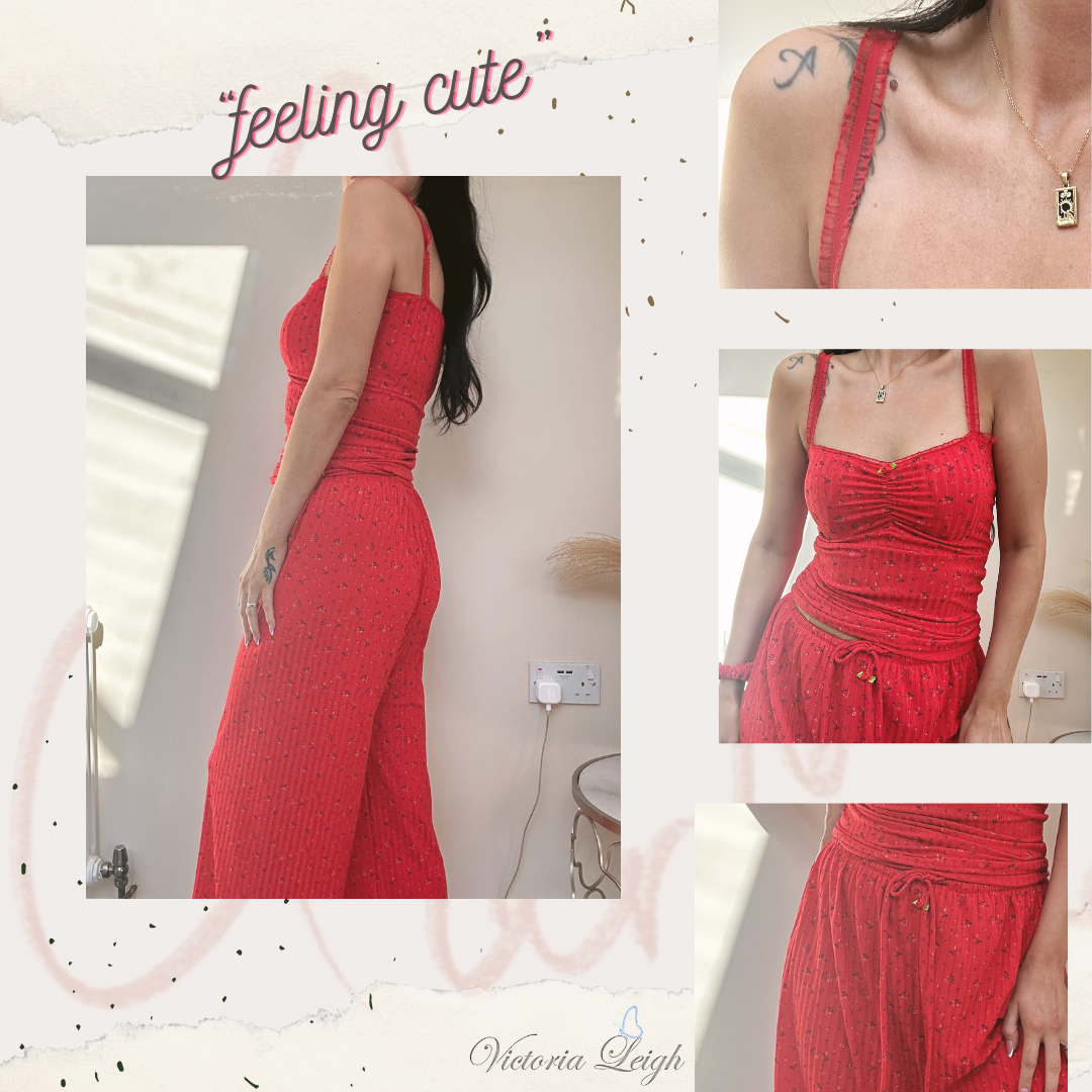 Cami top & trousers.Top features: cami style top, elasticated frill straps, frill trim gathered bust.Trouser features: wide leg trousers, elasticated waist and a drawstring tie.