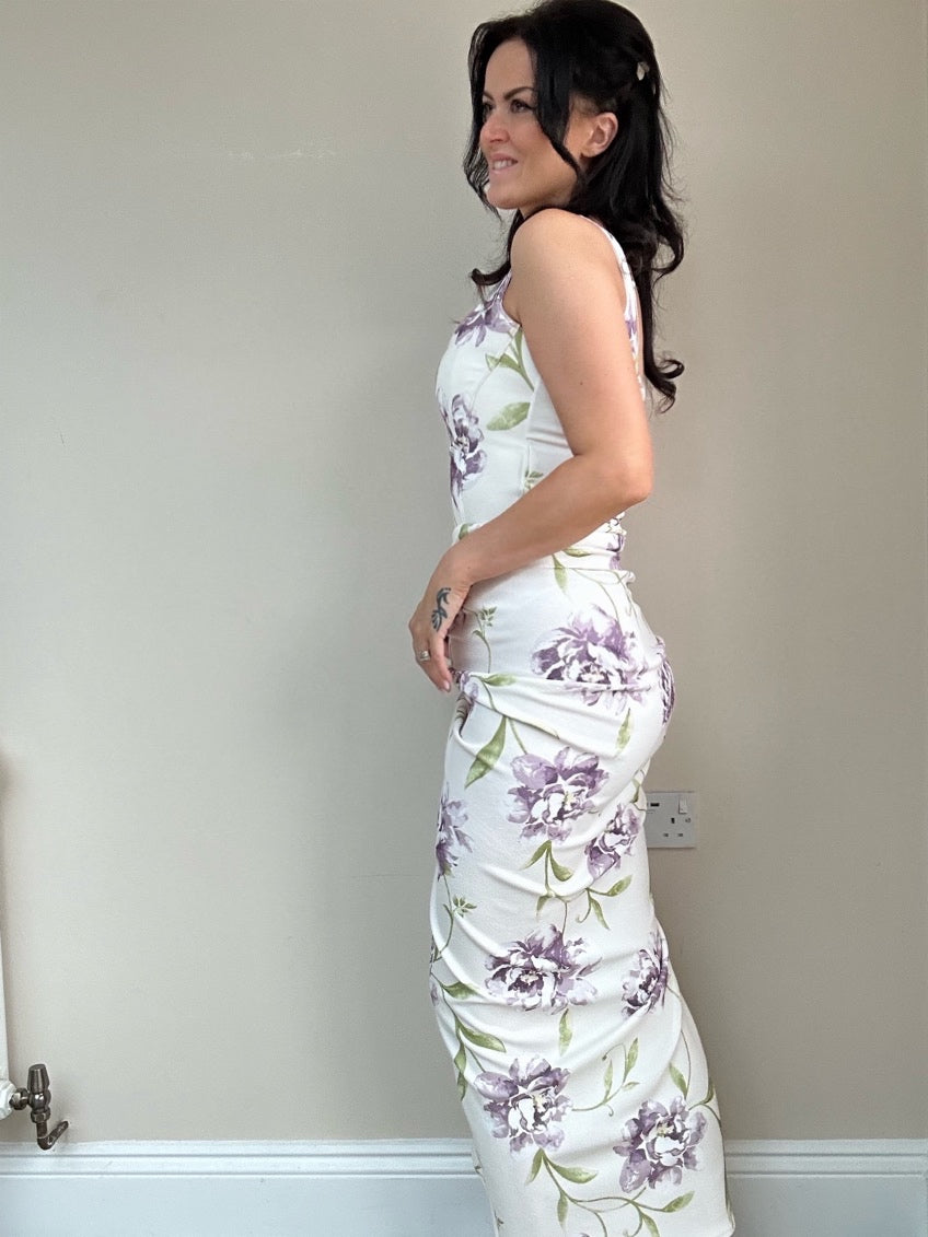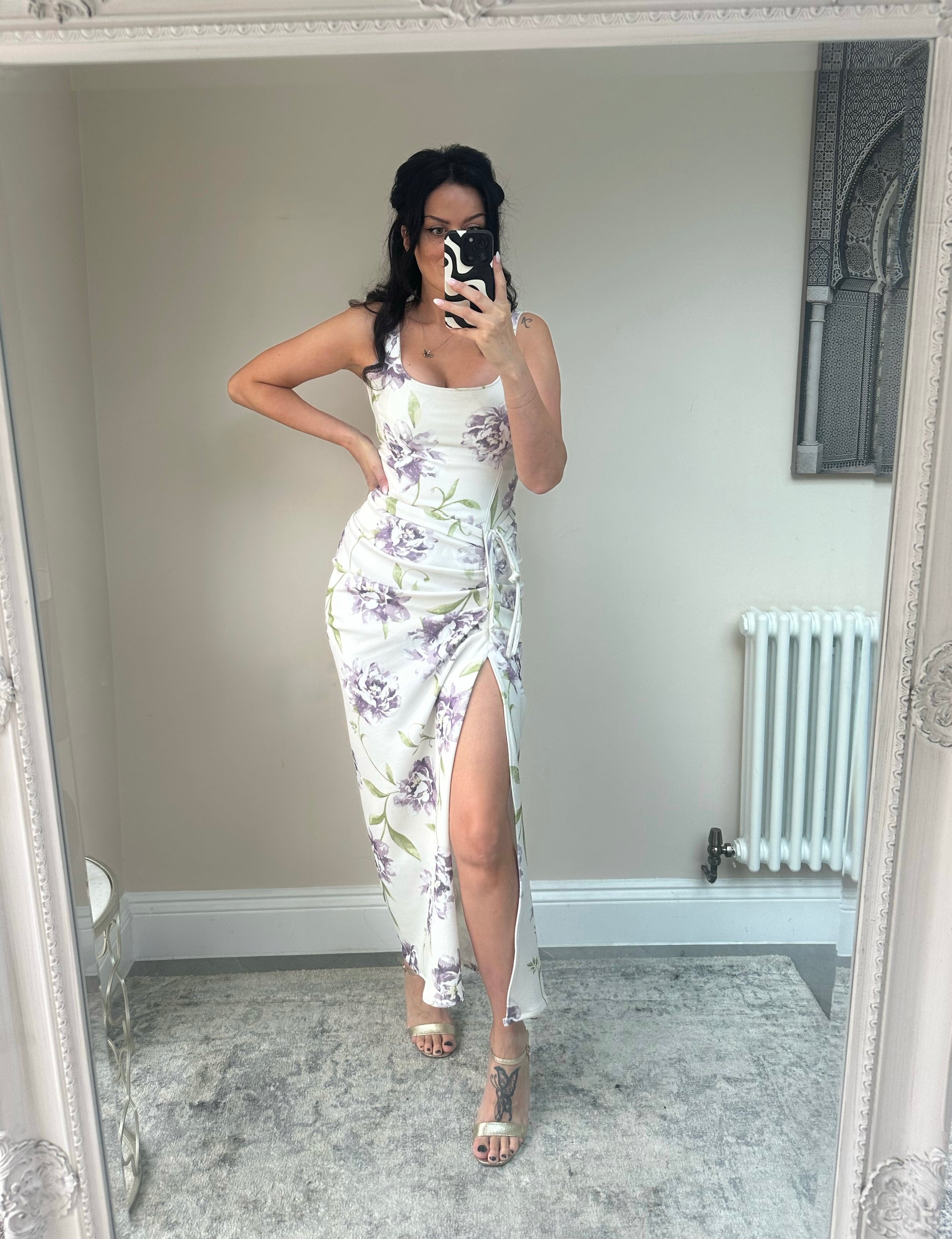 Ruched detail creating a beautiful silhouette. Tie waist with front split. Midi length.