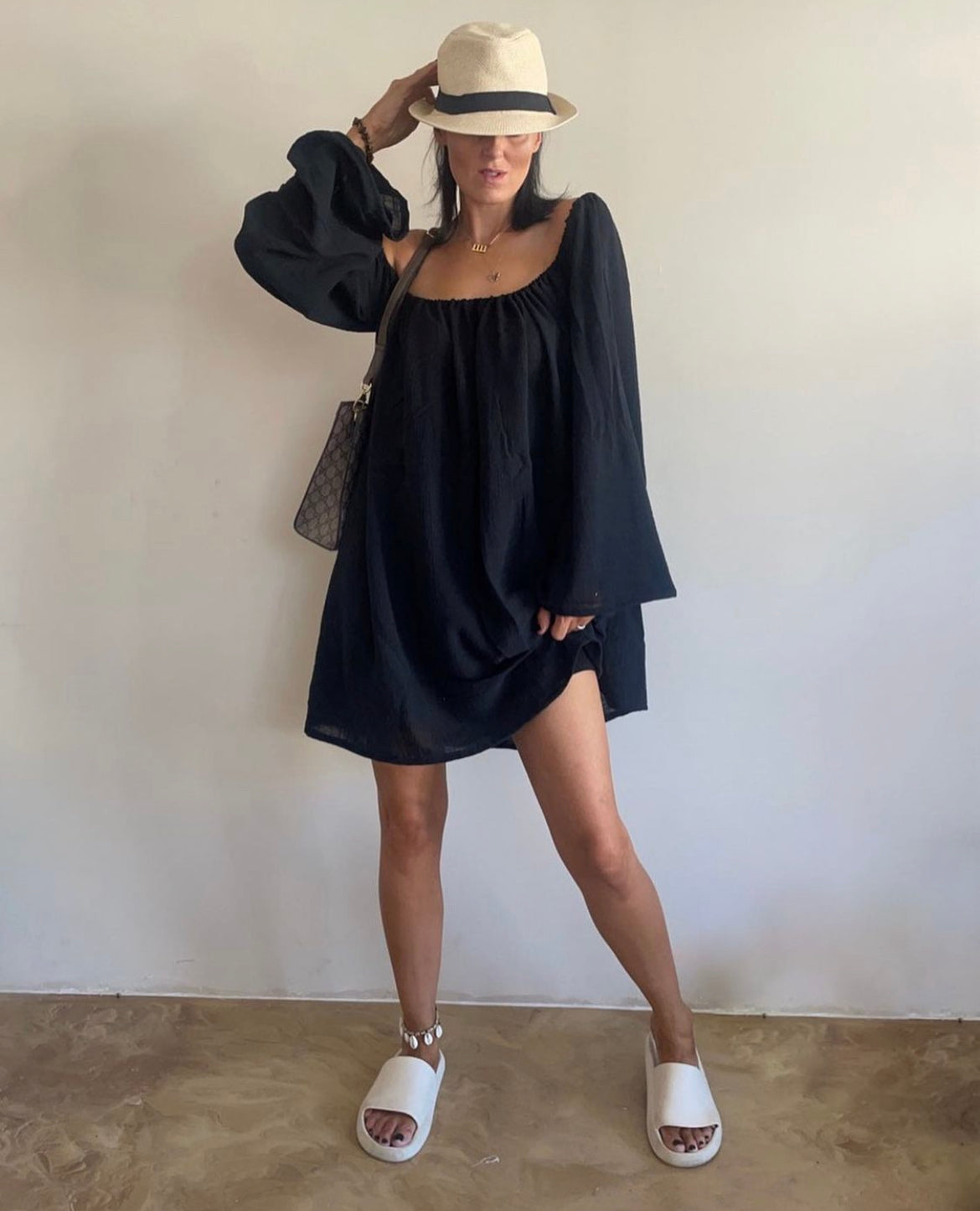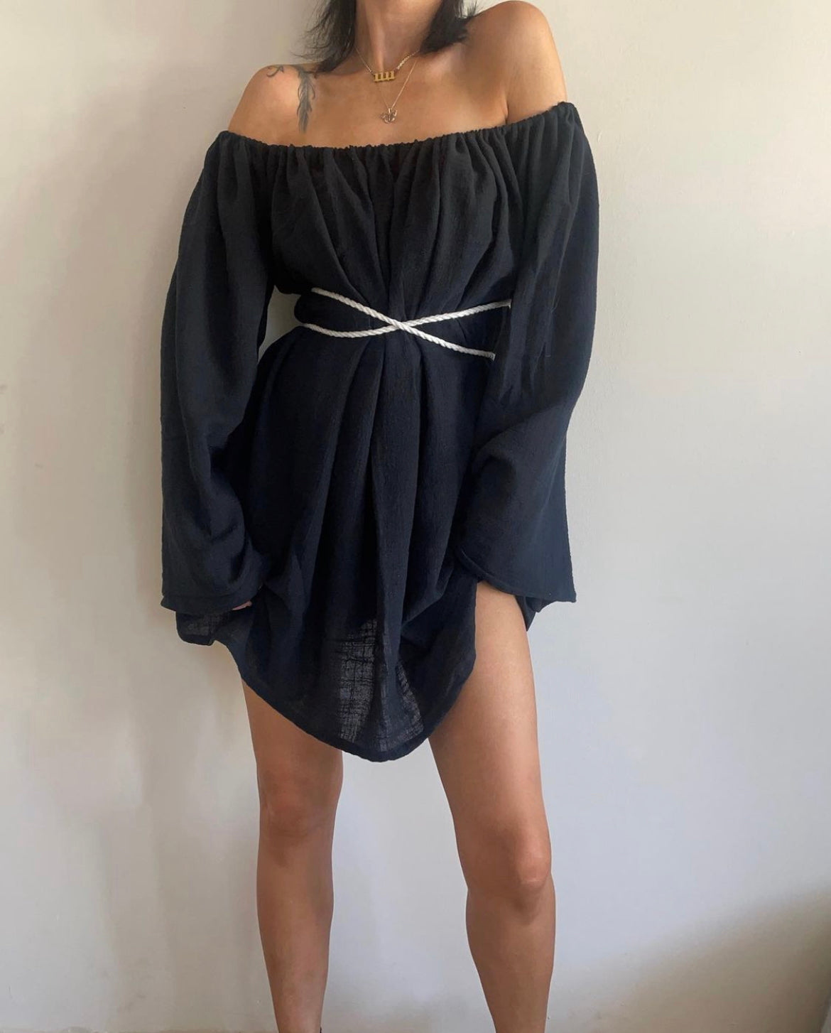 Elasticated shoulder. Wide sleeves.