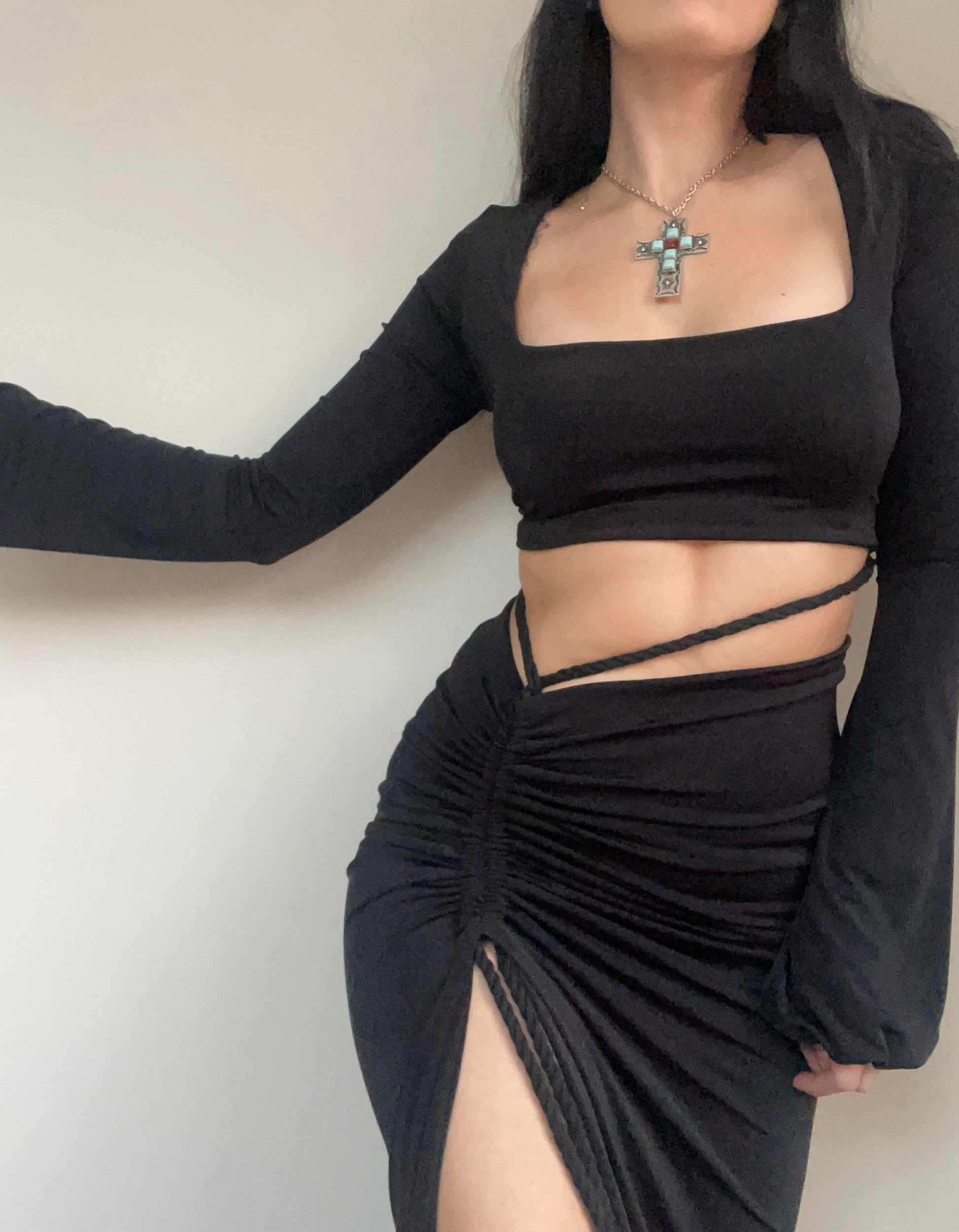 The deep side slit shows off the length of the leg creating a sexy feel. Depth of slit can be altered to your preference by adjusting the rope tie.