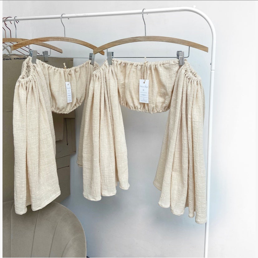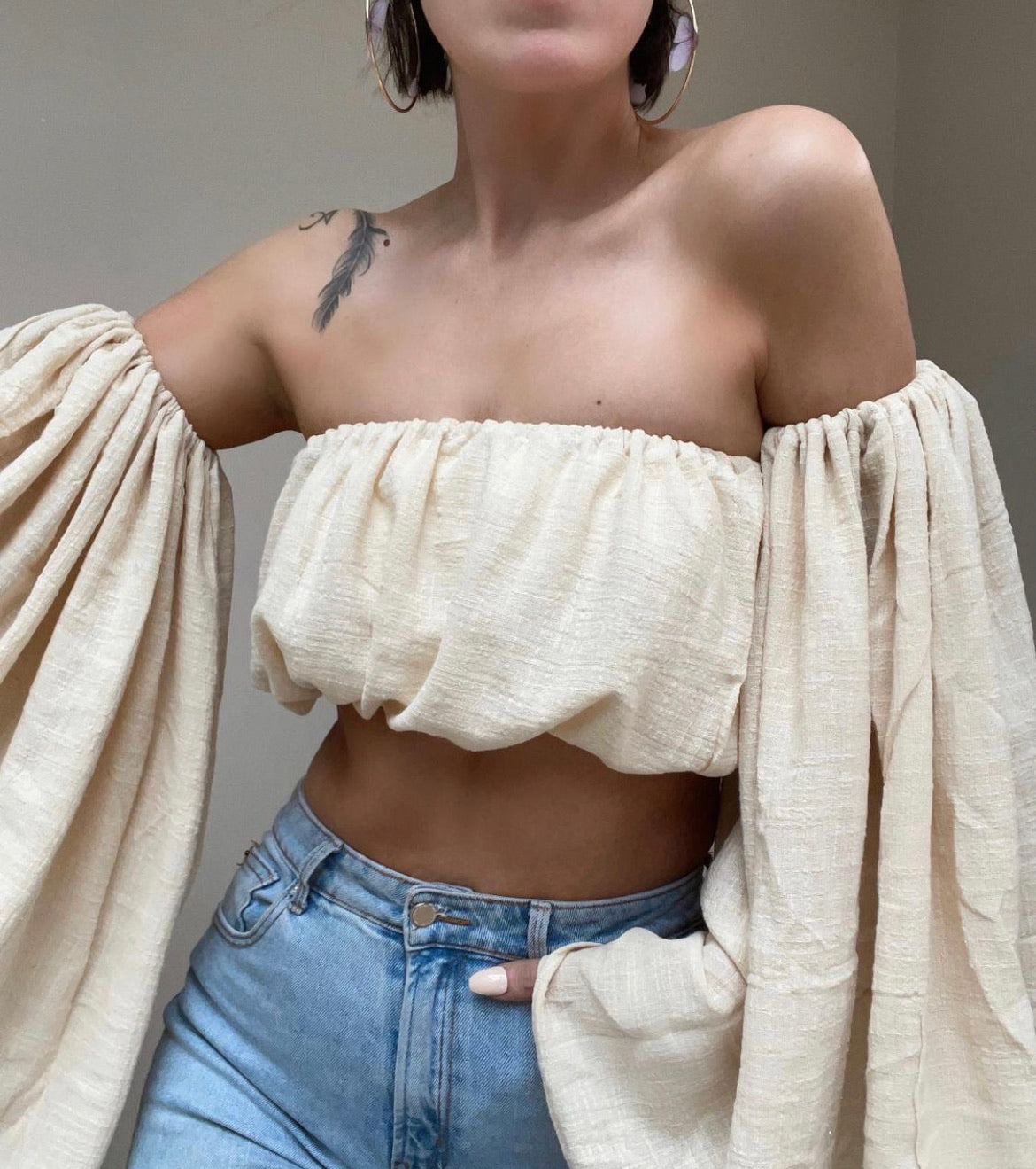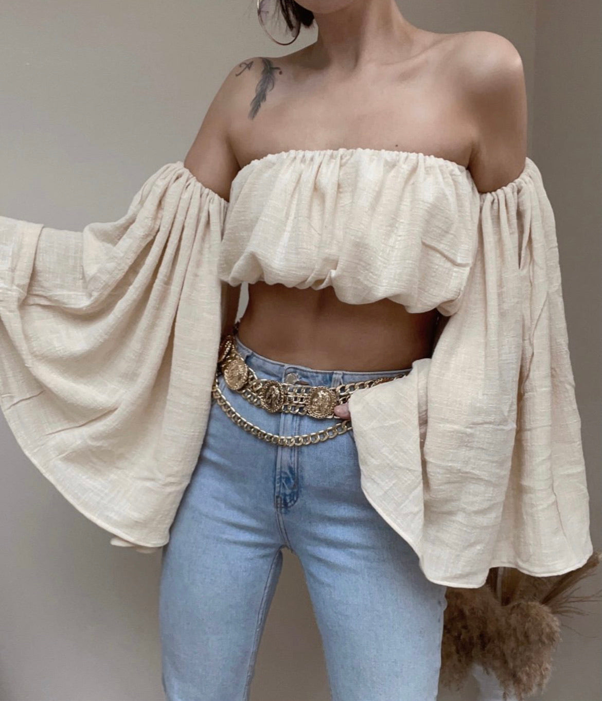 Elasticated Bandeau Crop Top with Removable Flare Sleeves.