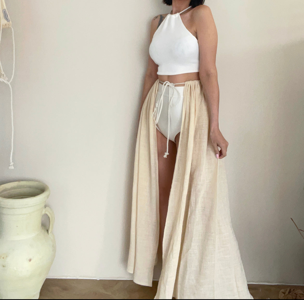 MODEL WEARS: beige linen. Size 10.