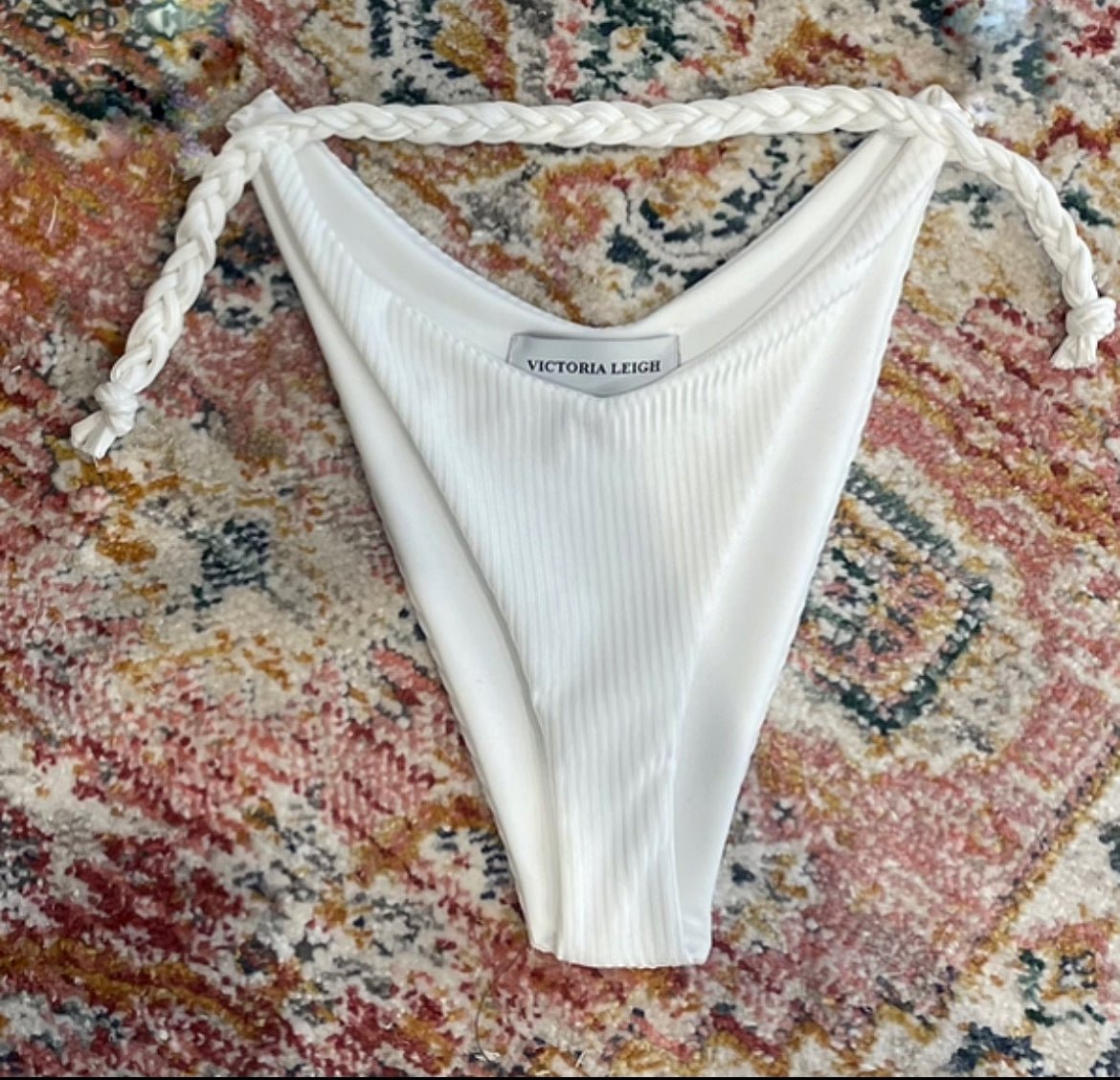 The Maia plait bikini bottoms . ‘Cheeky’ style bottoms with ‘V’ cut design. Available in Ivory rib fabric. Double lined. Hand plaited detail embellishment to front of bottoms.