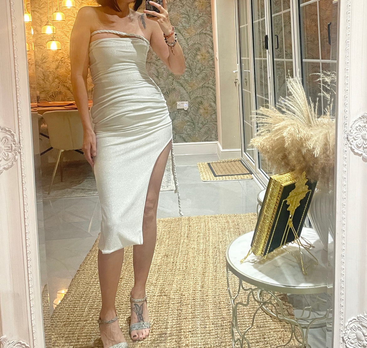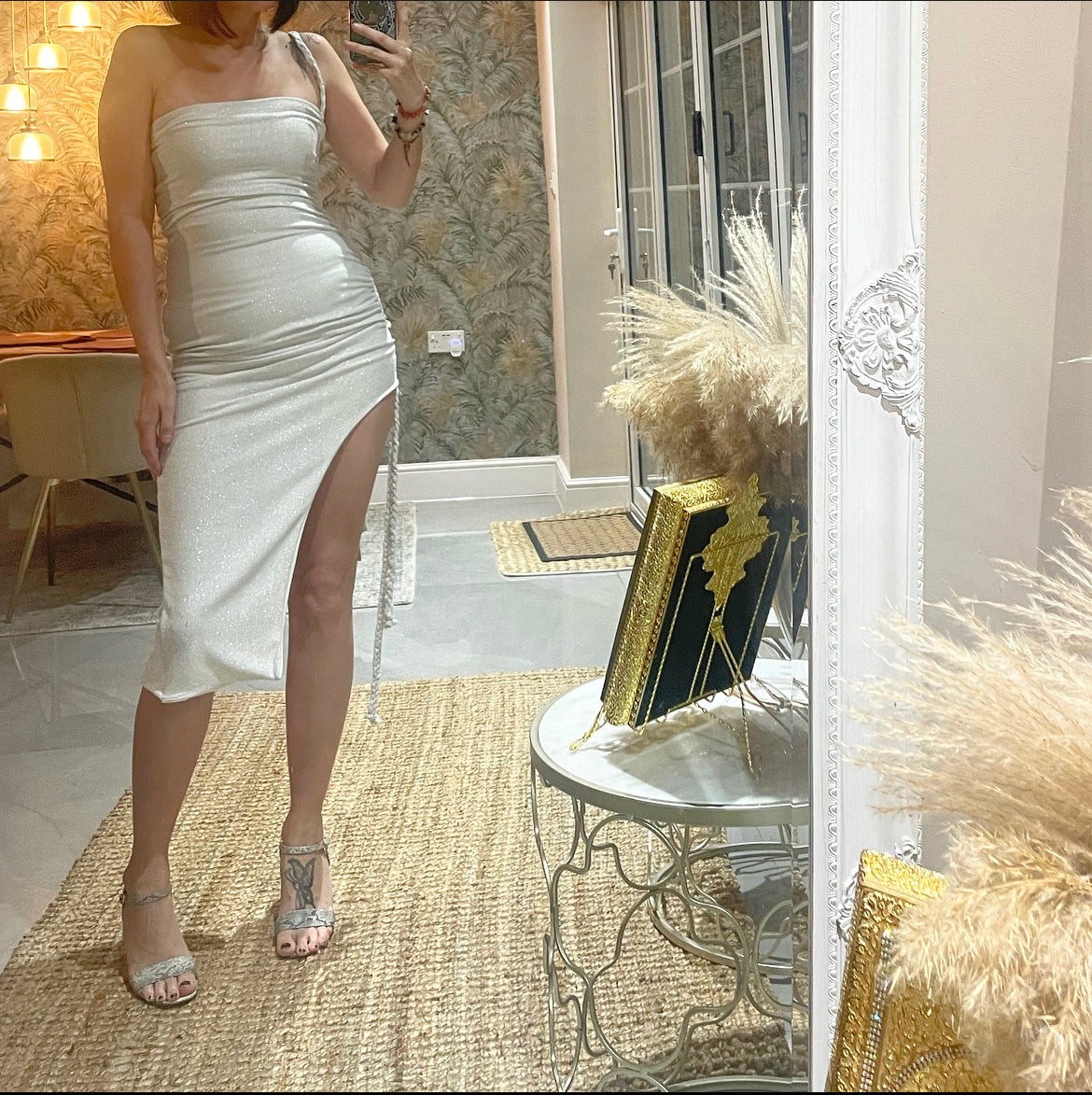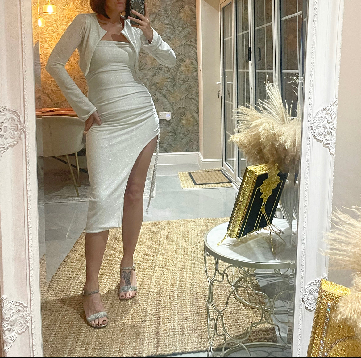 MODEL WEARS: white knit silver sparkle. Size 10.