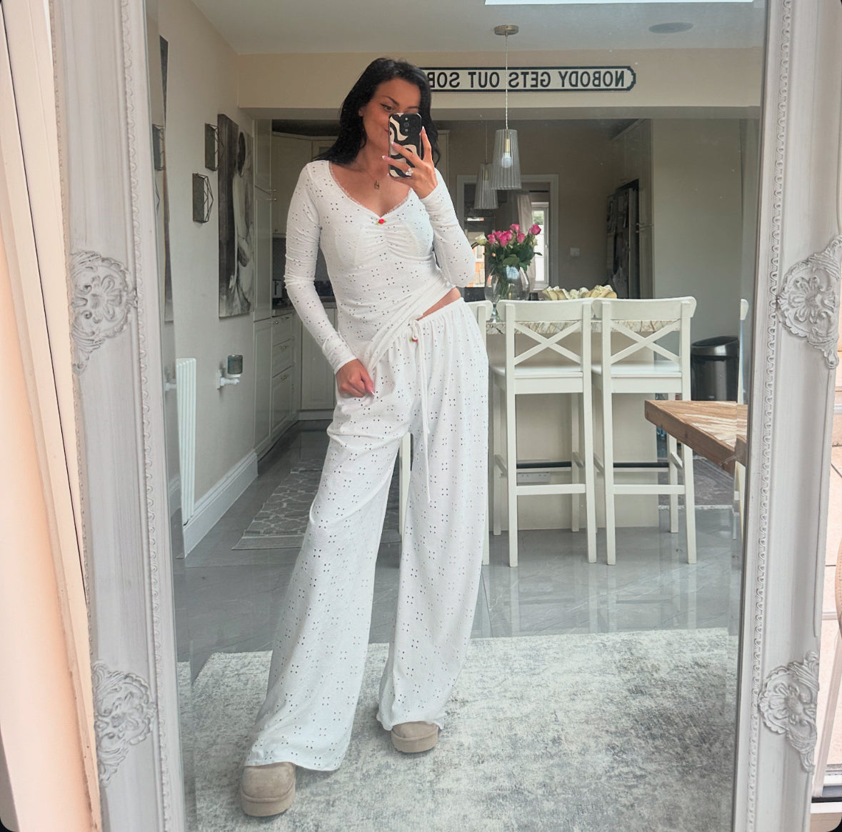 Long sleeve Top & Trousers.Top features: Long sleeves, gathered bust with a soft frill trim finish.Trouser features: wide leg trousers, elasticated waist and drawstring tie.