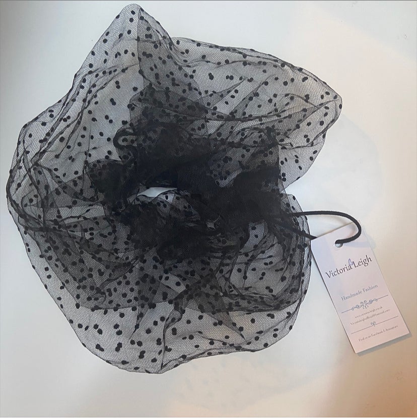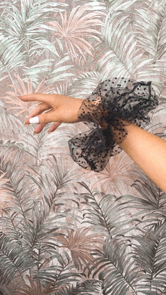 Made to order. Netting material. Small Polka dot detail. Secure elastic for desired tying. Gold butterfly embellishment.