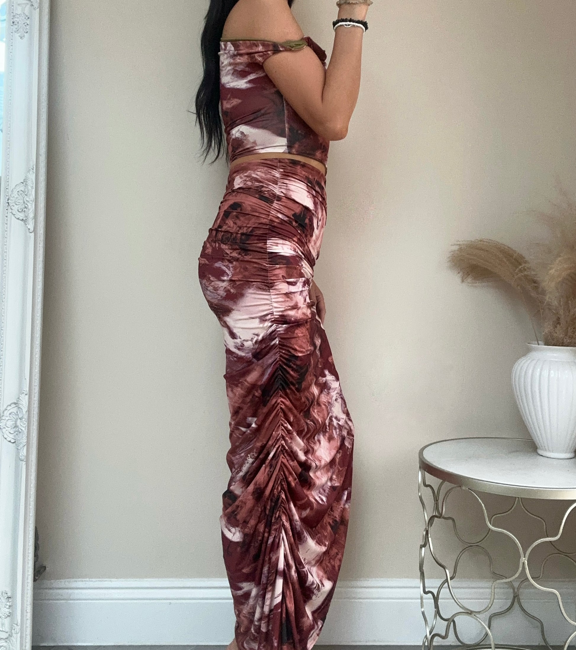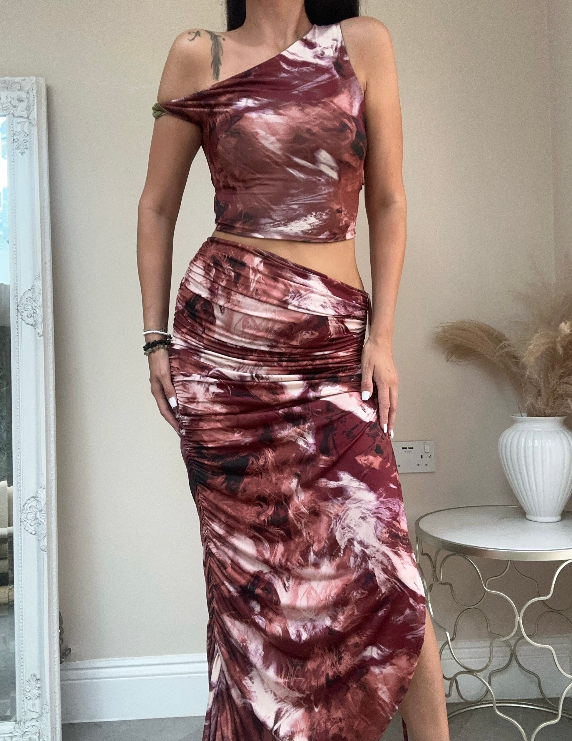 Featuring long ruched side detail to one side and the other side a ruched tie with side slit.