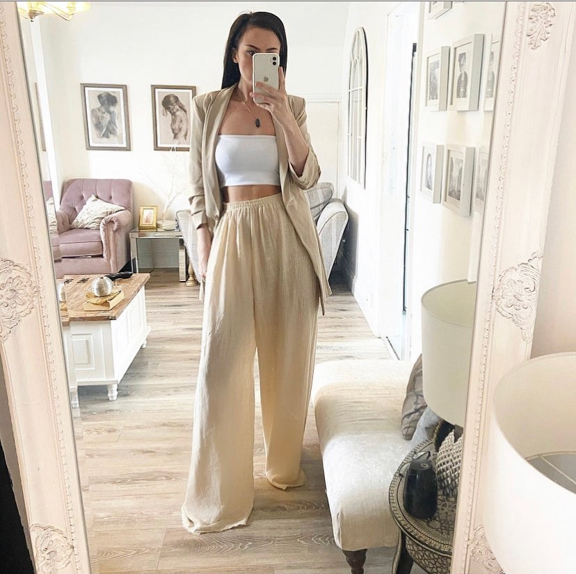 MODEL WEARS: Beige Cotton linen. Size UK10