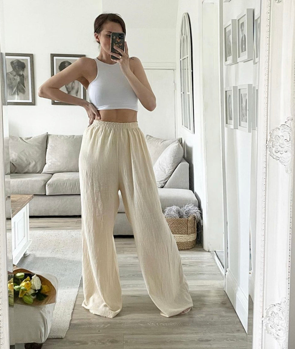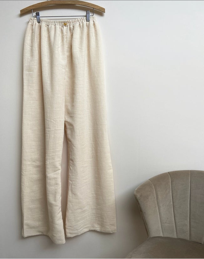 Elasticated High waisted wide leg trousers available in Cotton Linen fabric.