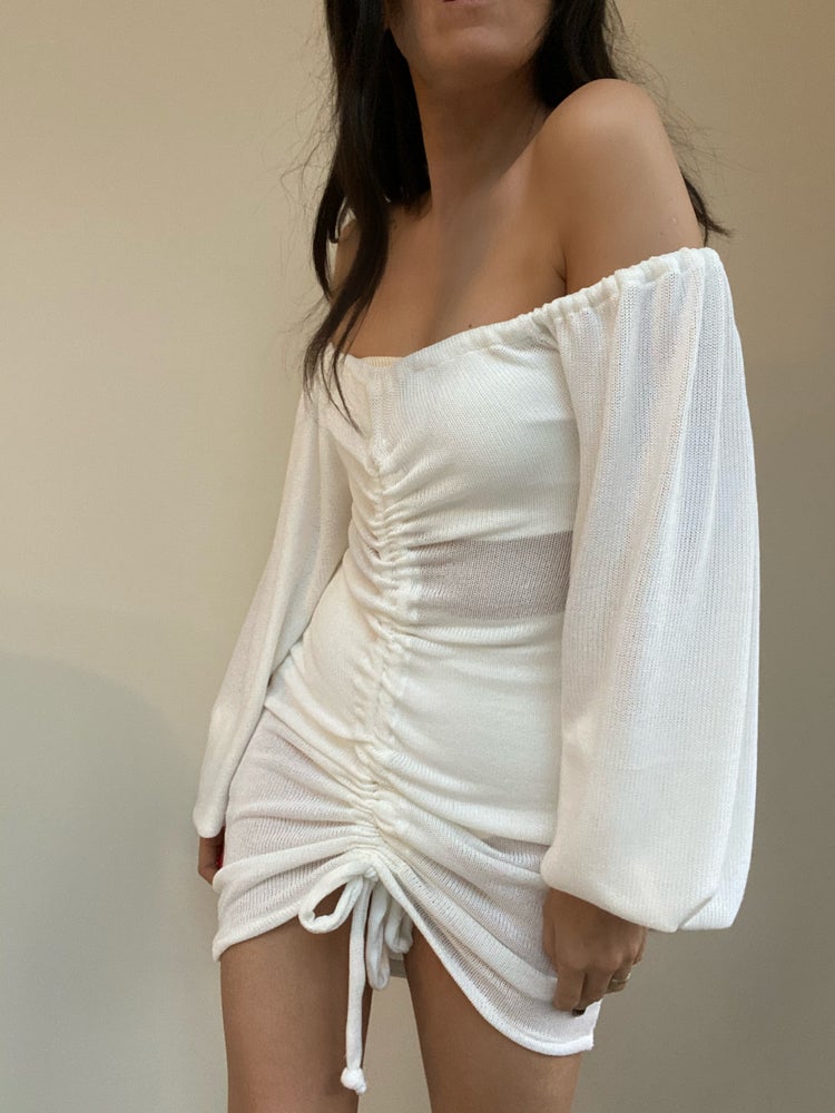Featuring long bell sleeves. Single lined fine knit fabric. In white.