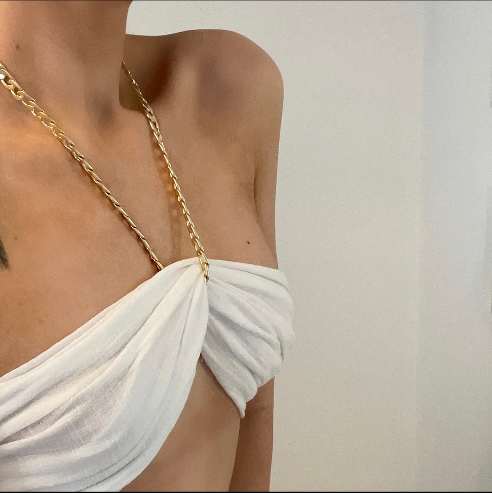 With hand frayed edging. It can be worn in many ways; As a top using included chain necklace. Or as a shoulder shawl or mini sarong.