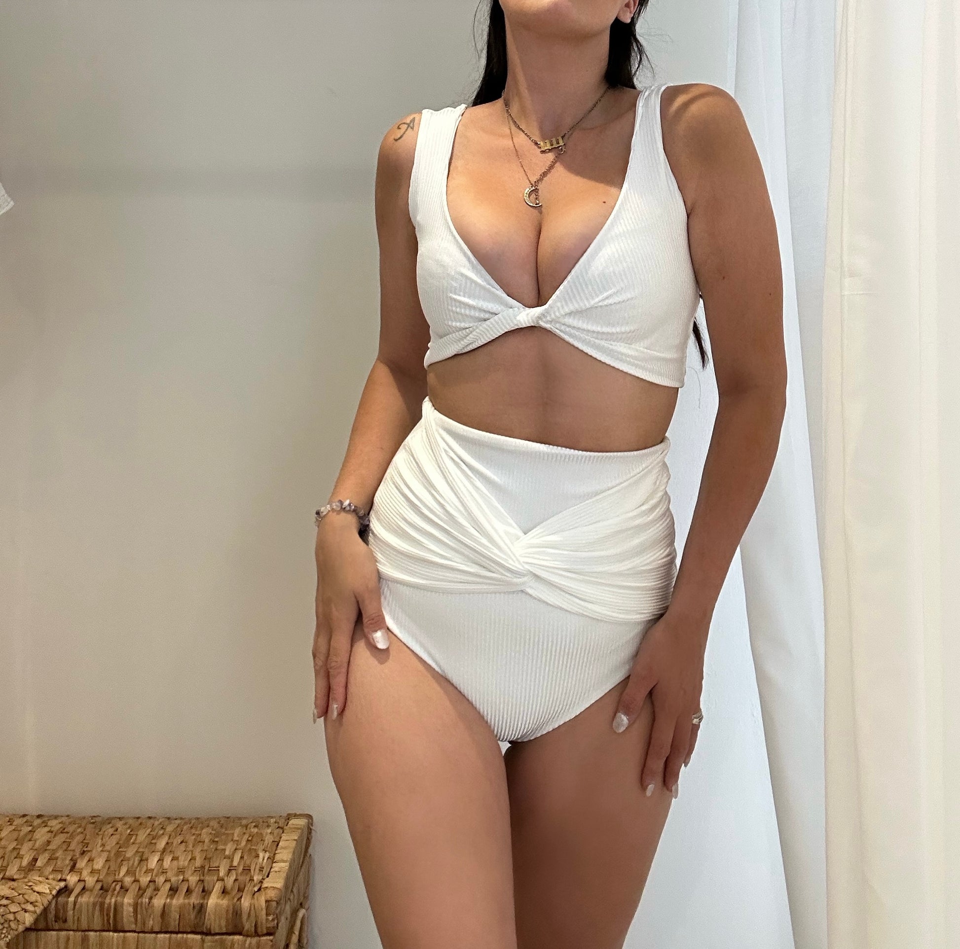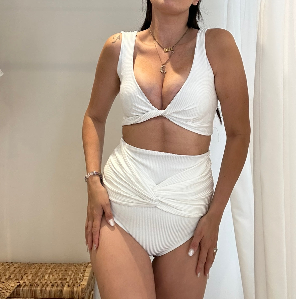 ‘cheeky’ style bottoms. Twist detail creates a lovely silhouette while cinching the stomach area.
