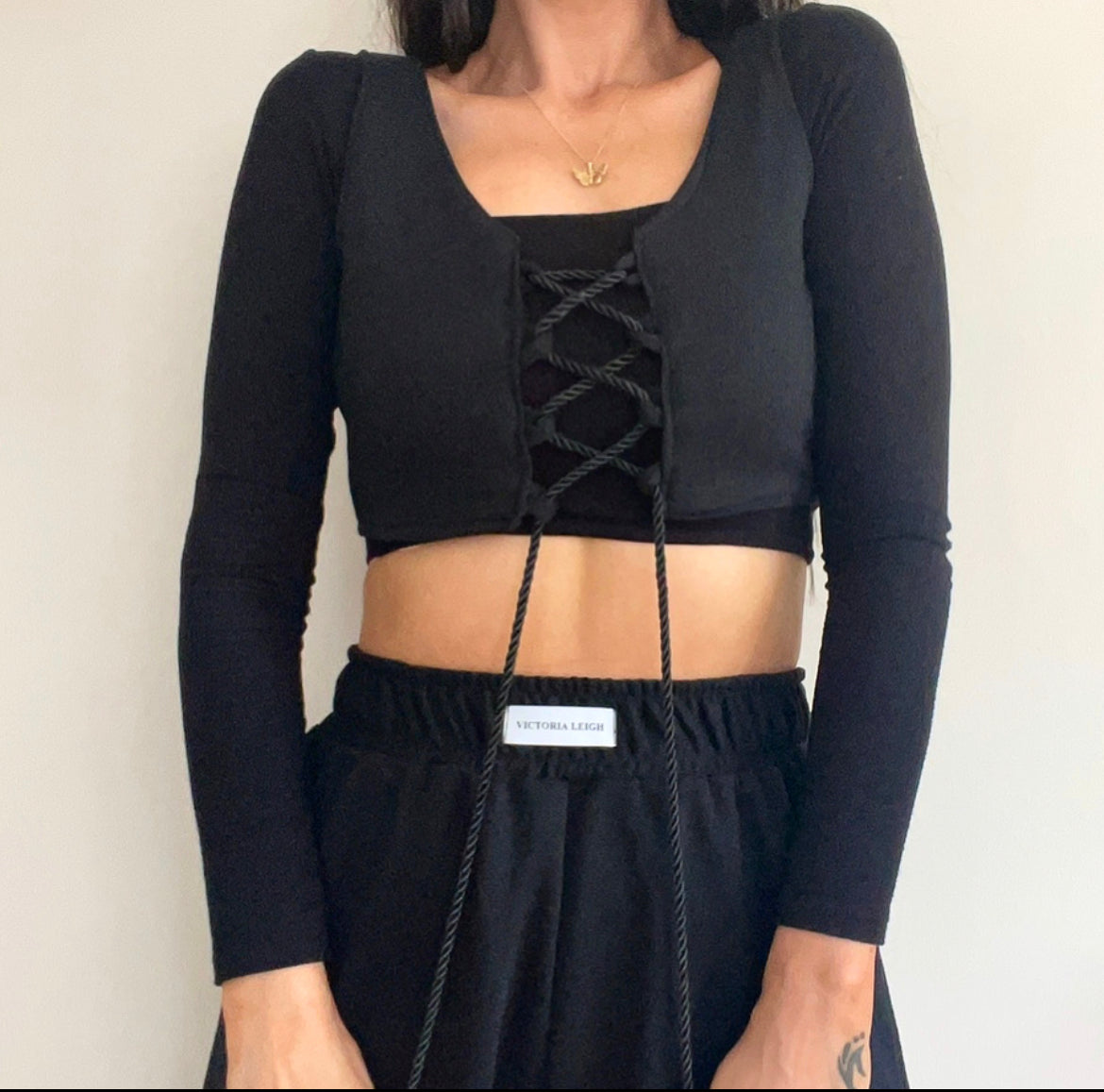 Features rope drawstring tie detail. Can be worn either way. One side featured the rope tie up. One side features a scoop neck style with stitch detail.