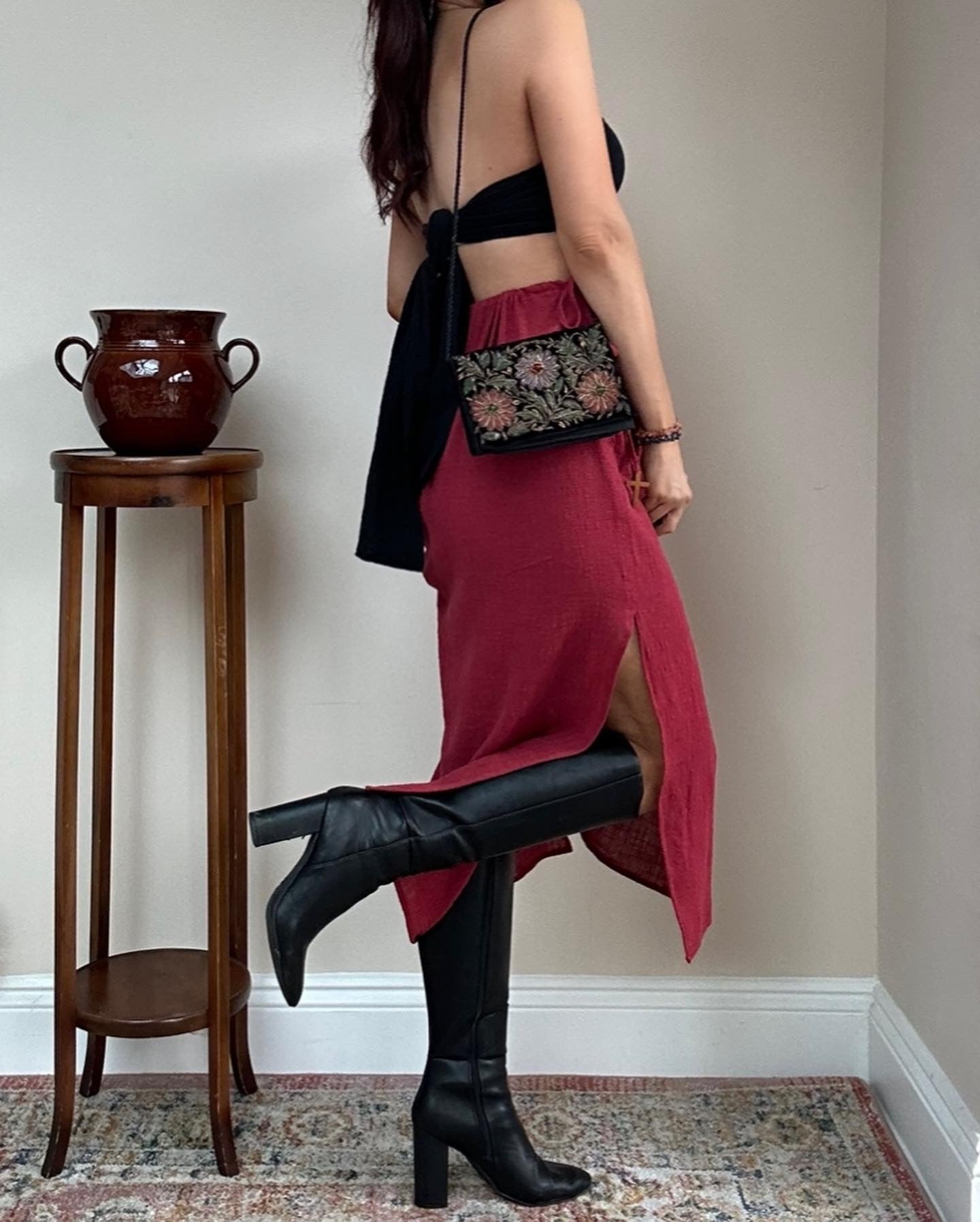 MODEL WEARS: • Dark Red Cotton linen. • Size 29.5” waist.
